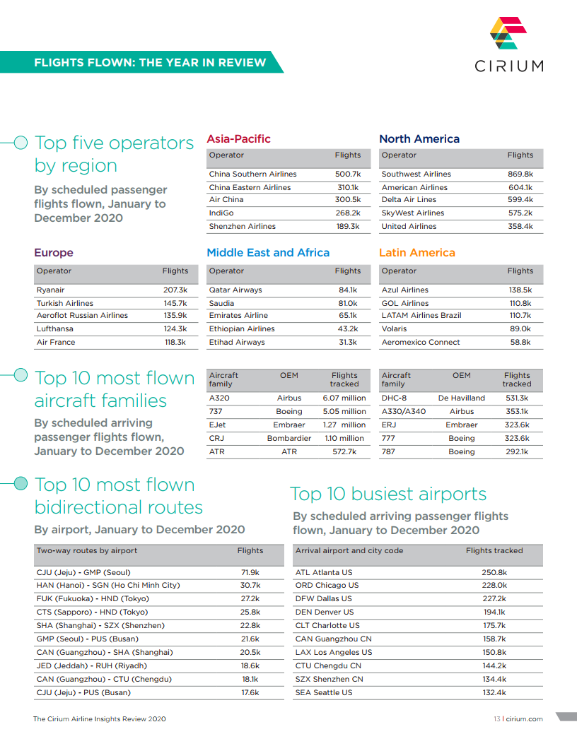 Cirium数据分析显示,西南航空公司 (Southwest Airlines)在全球(和北美地区)执飞的航班最多,总计达85.48万架次。同时,中国南方航空公司以48.77万架次在亚太地区、瑞安航空 (Ryanair)以20.5万架次在欧洲地区、巴西阿苏尔航空(Azul)以13.4万架次在拉美地区、卡塔尔航空(Qatar Airways)以8.24万架次在中东和非洲地区,分别拔得头筹。