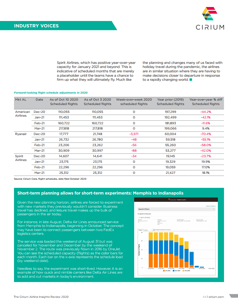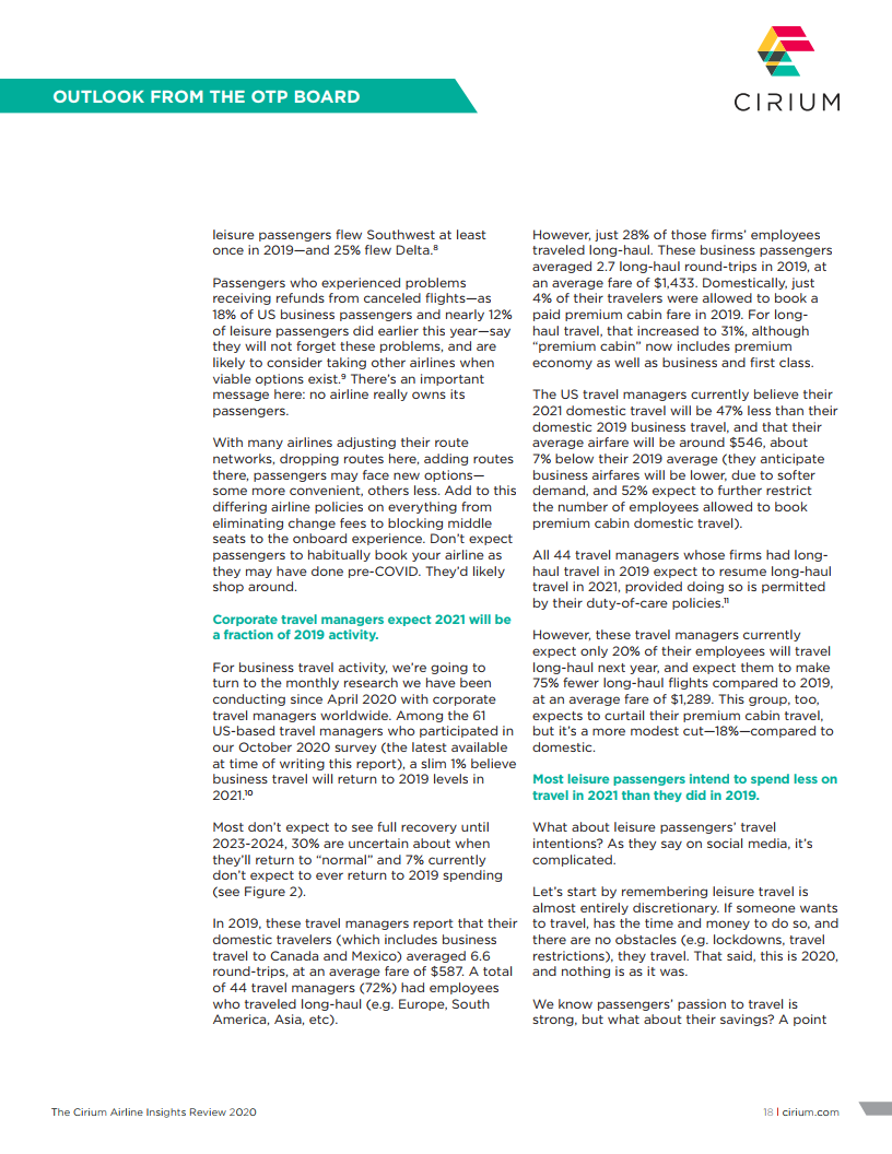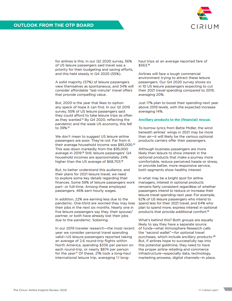 1. 航空公司合并,特别是在亚太地区,更多的国内竞争对手将合并或被收购。2. 新一代飞机,如A320neo和复飞的737 Max将降低运营成本。3. 过剩飞机将退役,预计波音747和空客A380将被用于支持密集型休闲市场不断增长的需求。4. 与去年同期相比,第四季度预订量下降了78%,这自然会改变行业预测需求的方式。在线搜索和情绪将成为计算需求的主要指标。5. 航空公司需要部署更动态的调度能力以适应增加的航班调度波动性,因为预订时间从6至12个月缩短到6至8周。6. 人工智能技术的实施将加速旅客体验的自动化,实时主动信息将变得更加关键。7. 飞机租赁将超过50%,成为飞机融资的主要方式。