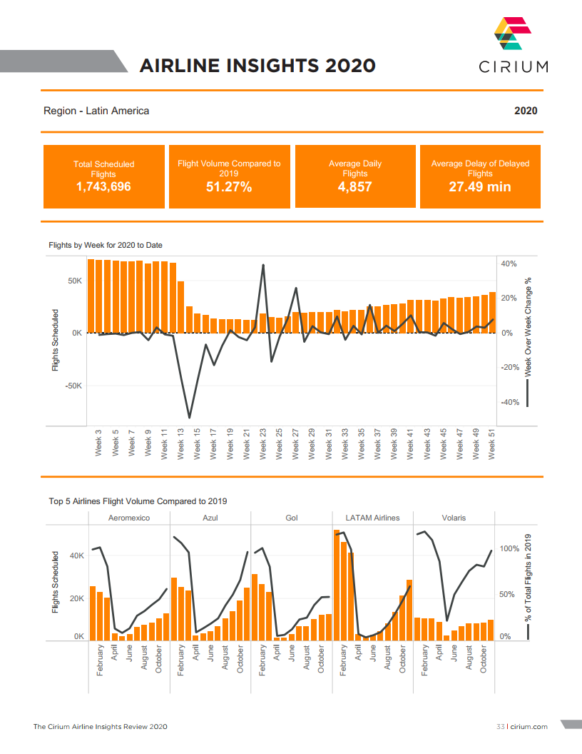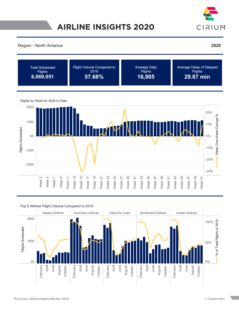 与2019年相比,2020年航空公司1月到12月运营的航班数减少了49%,从3320万架次减少到1680万架次(截至12月20日)。国内航班与去年的2150万架次相比下降了40%,国际航班下降幅度更大,与去年的1170万架次相比下降了68%。