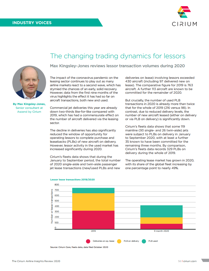 由于航空公司被迫大幅减少在役的飞机数量,仍在执飞的飞机运行时数也大大减少。举例来说,窄体机在2020年第三季度每天运行6至7小时,而去年同期每天运行9至10小时。