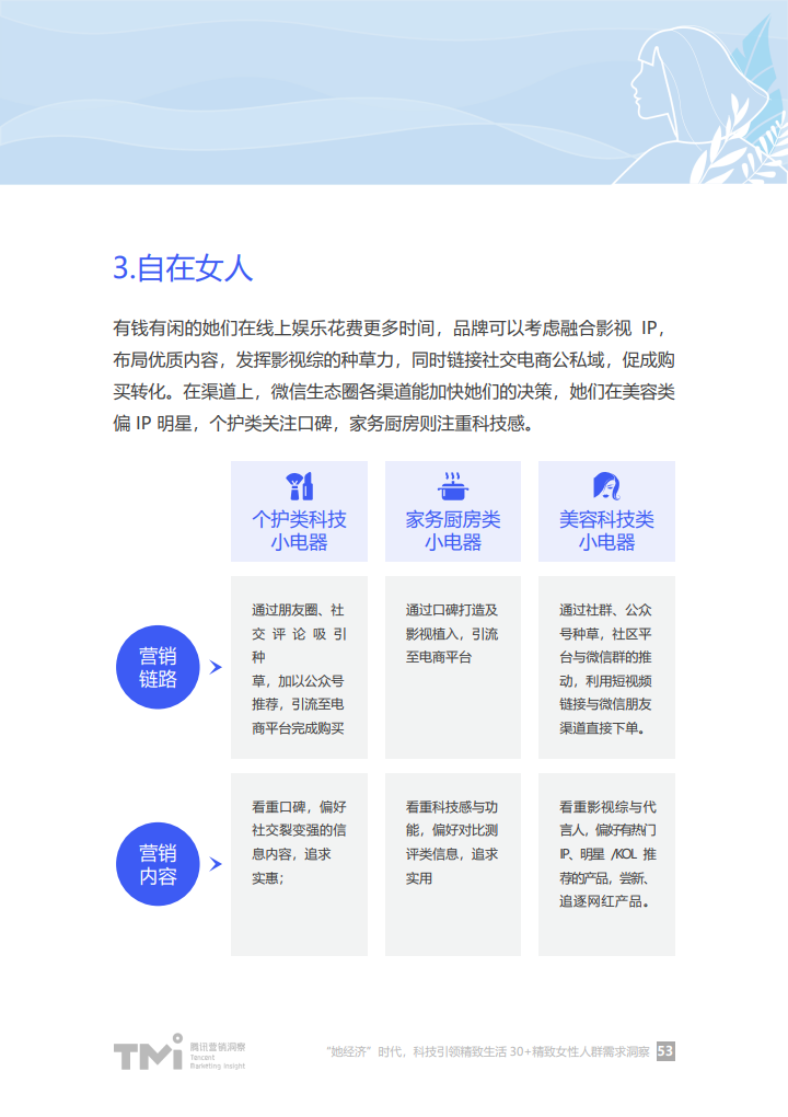 为提早抢占用户心智,科技小家电俘获精致女性需做到:精细化投放,瞄准高价值的30+精致女性人群,深度发展核心群体;拓展品牌传播范围,从公域到私域,实现引流到收割的品牌全链路营销;以品牌、产品为导向的内容,融合IP影视综影响力,实现精准拓客;人群多元化:不同30+女性圈层触达,通过数字化优势拓展更多的消费机会。