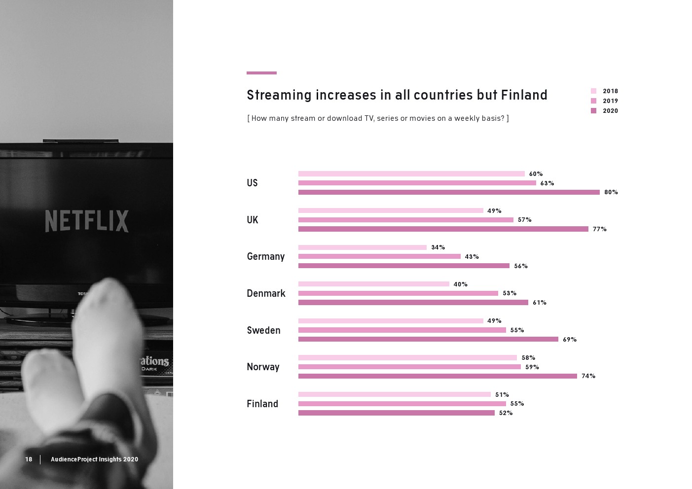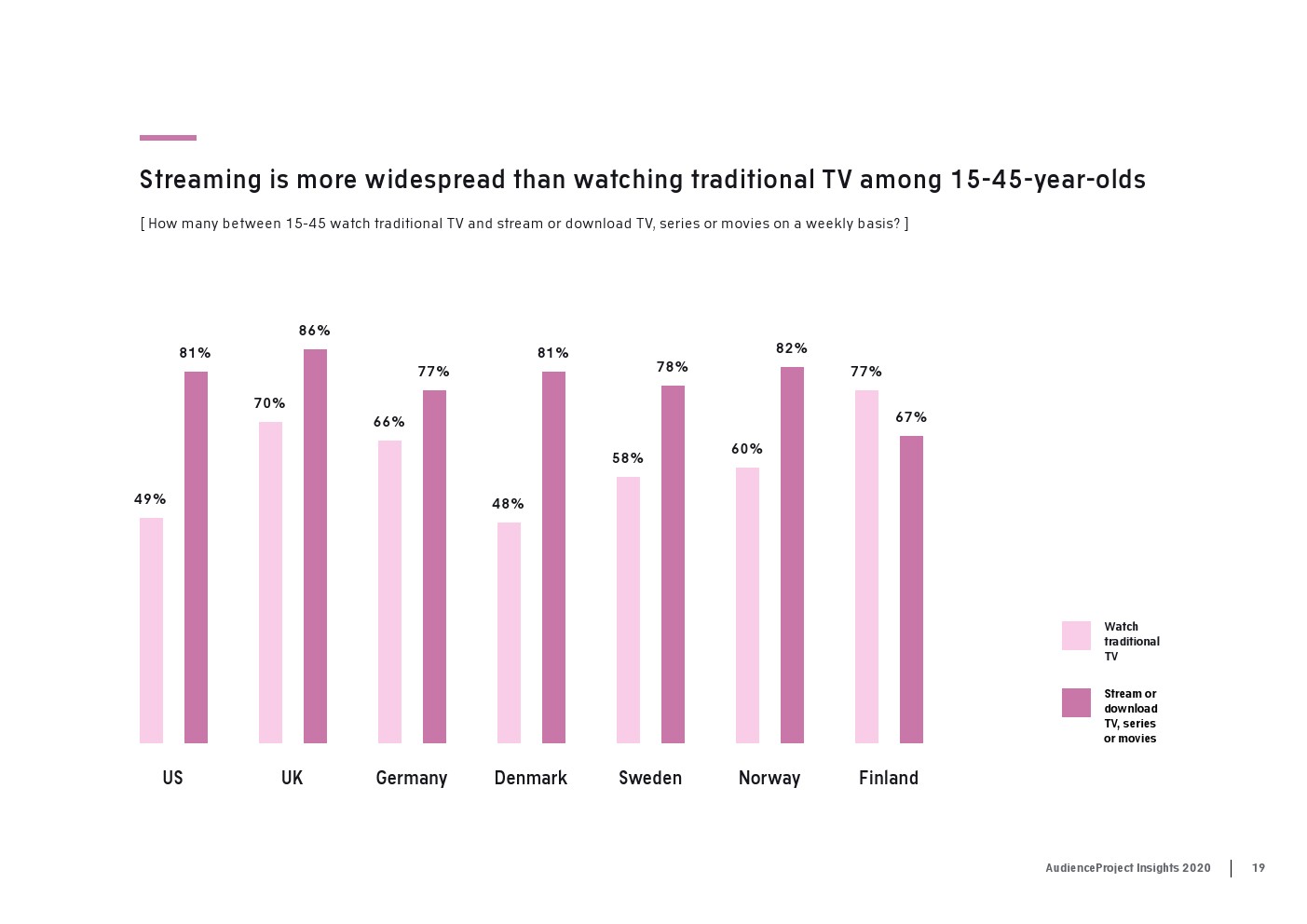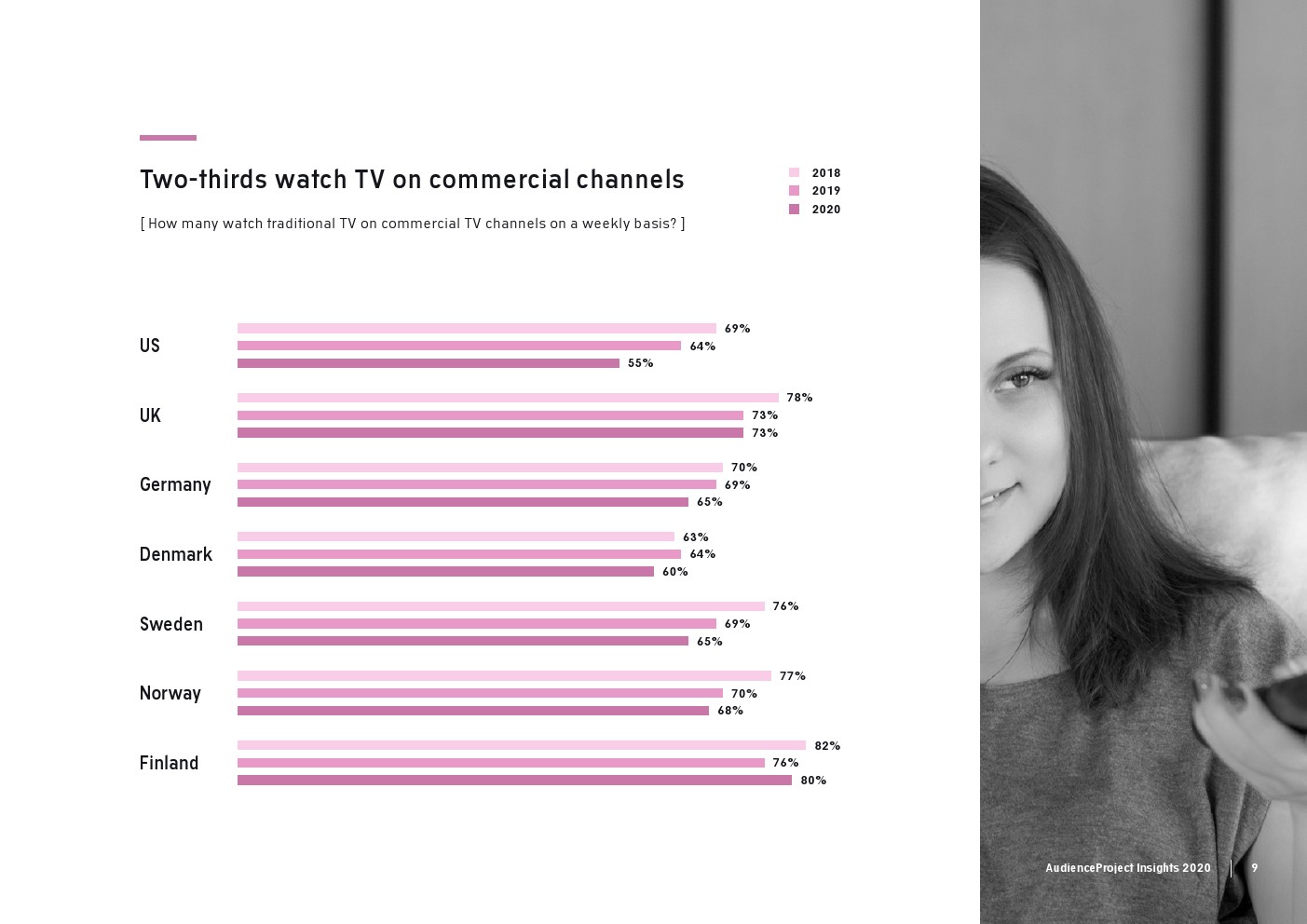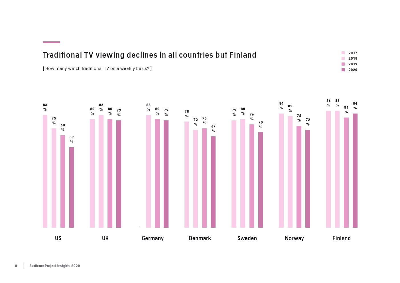 AudienceProject发布了新报告“2020年传统电视和流媒体洞察”。尽管数据显示,在大流行期间,人们看电视的次数比平时多,但在过去几年里传统电视收视率总体上稳步下降。事实上,2020年只有59%的美国消费者每周观看传统电视,而2017年这一比例为83%。