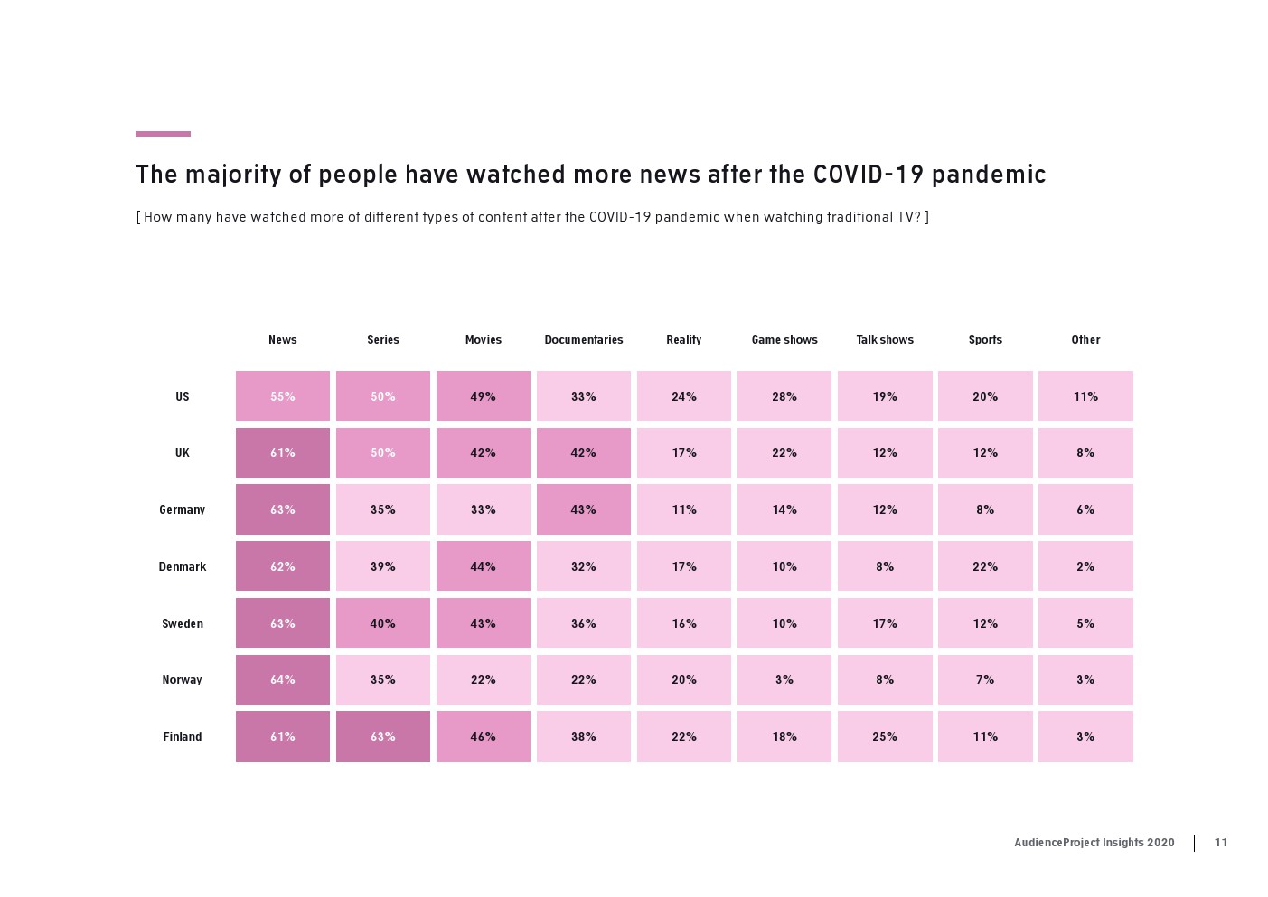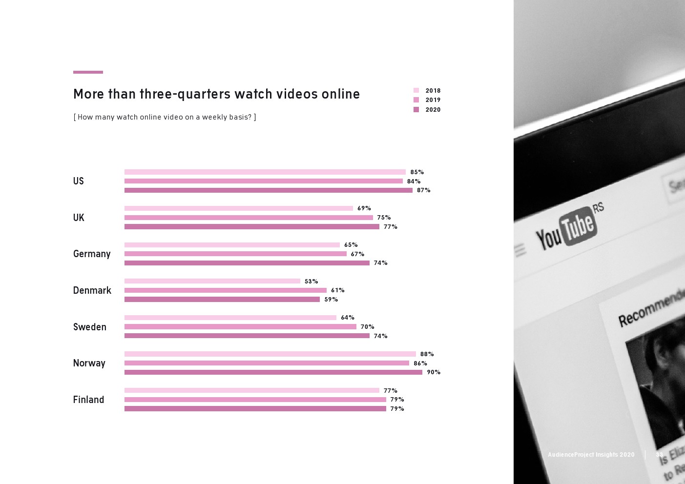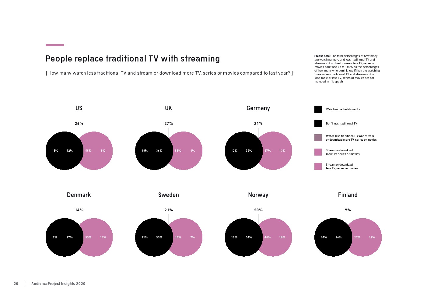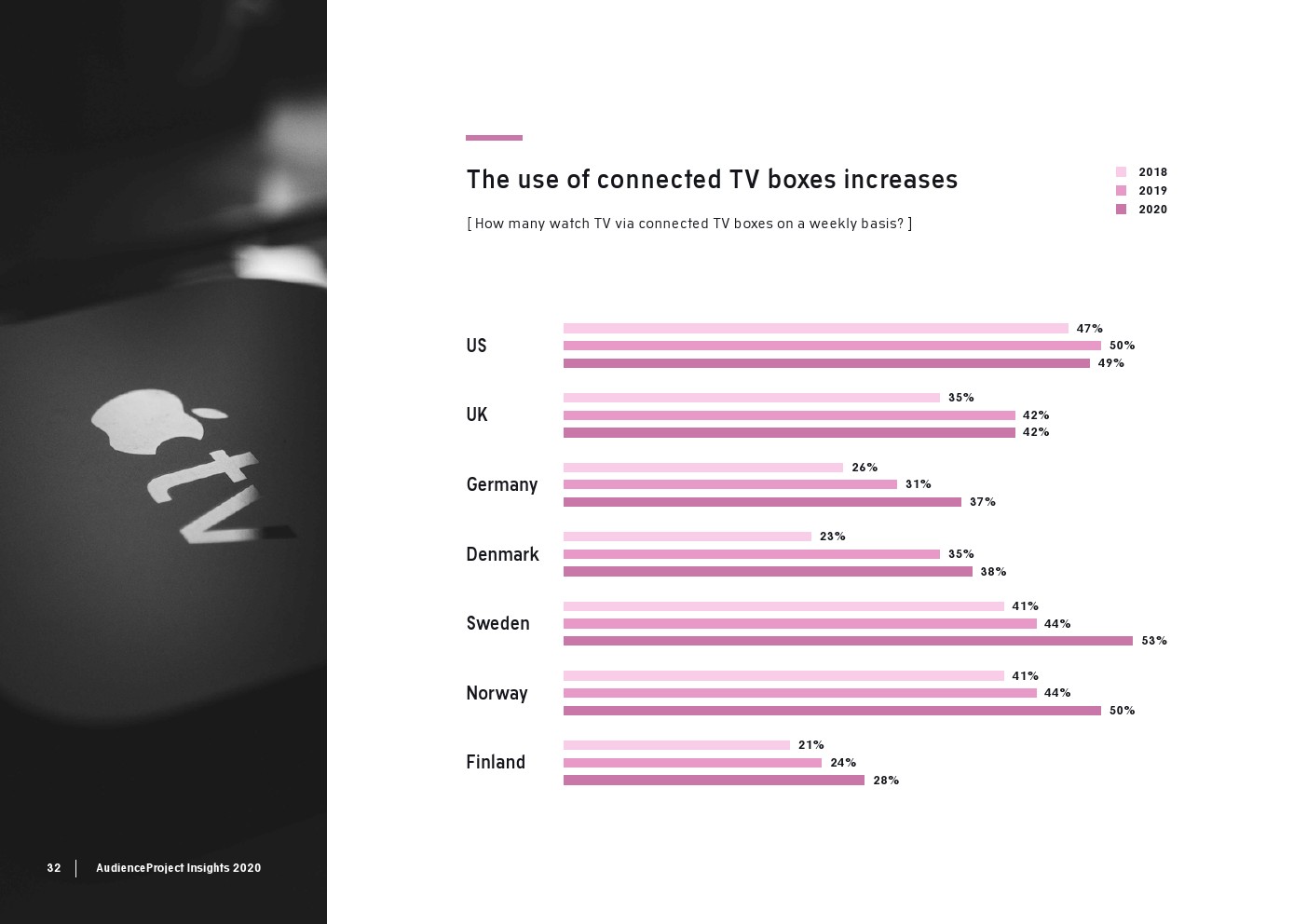 AudienceProject发布了新报告“2020年传统电视和流媒体洞察”。尽管数据显示,在大流行期间,人们看电视的次数比平时多,但在过去几年里传统电视收视率总体上稳步下降。事实上,2020年只有59%的美国消费者每周观看传统电视,而2017年这一比例为83%。