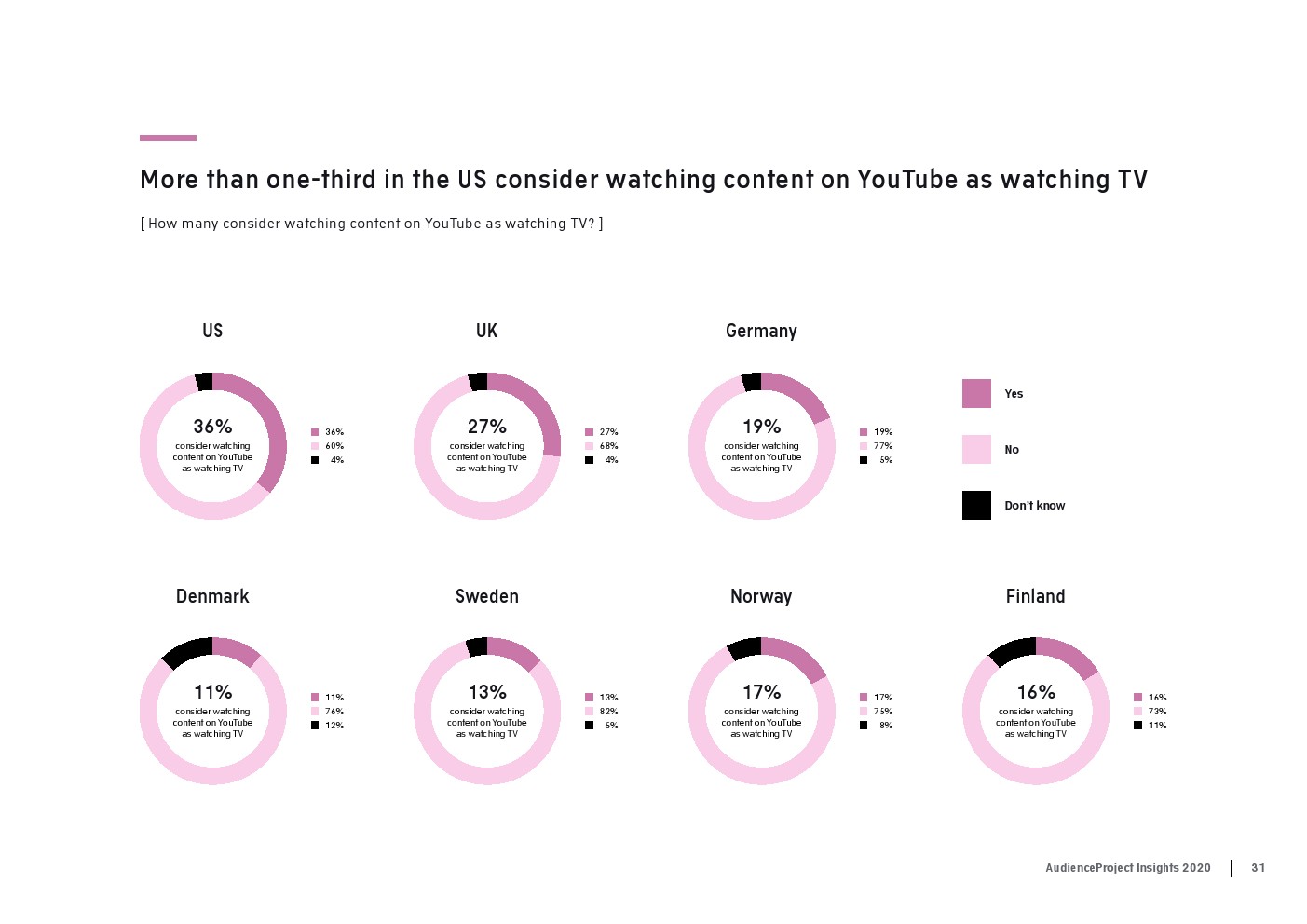 值得注意的是,超过1/3的美国受访者(36%)认为在YouTube上观看内容就像看电视一样。与此同时,越来越多的受访者在电视屏幕上观看YouTube。