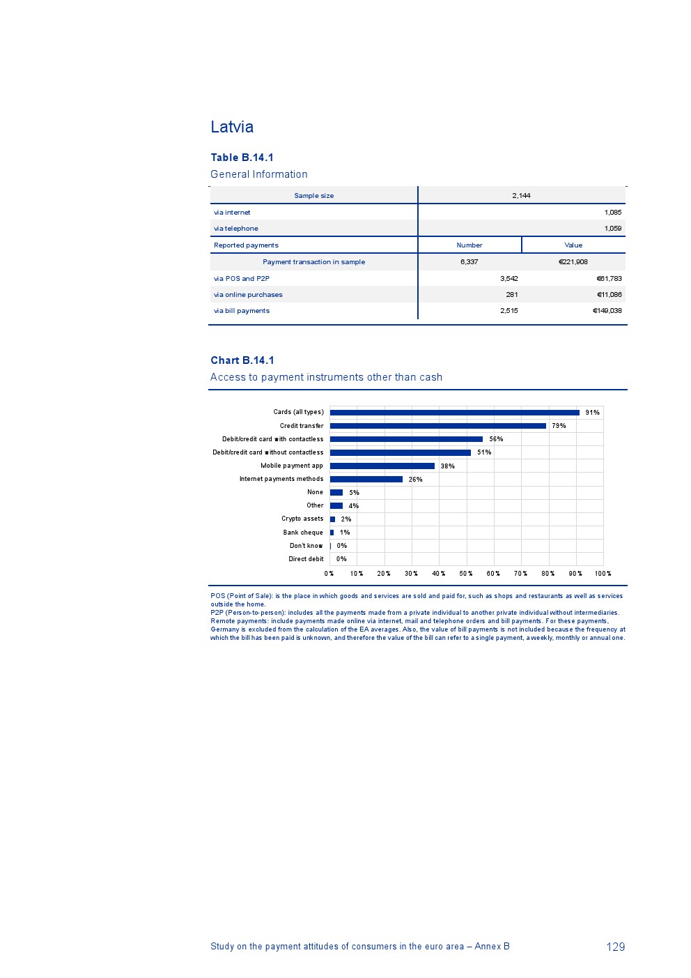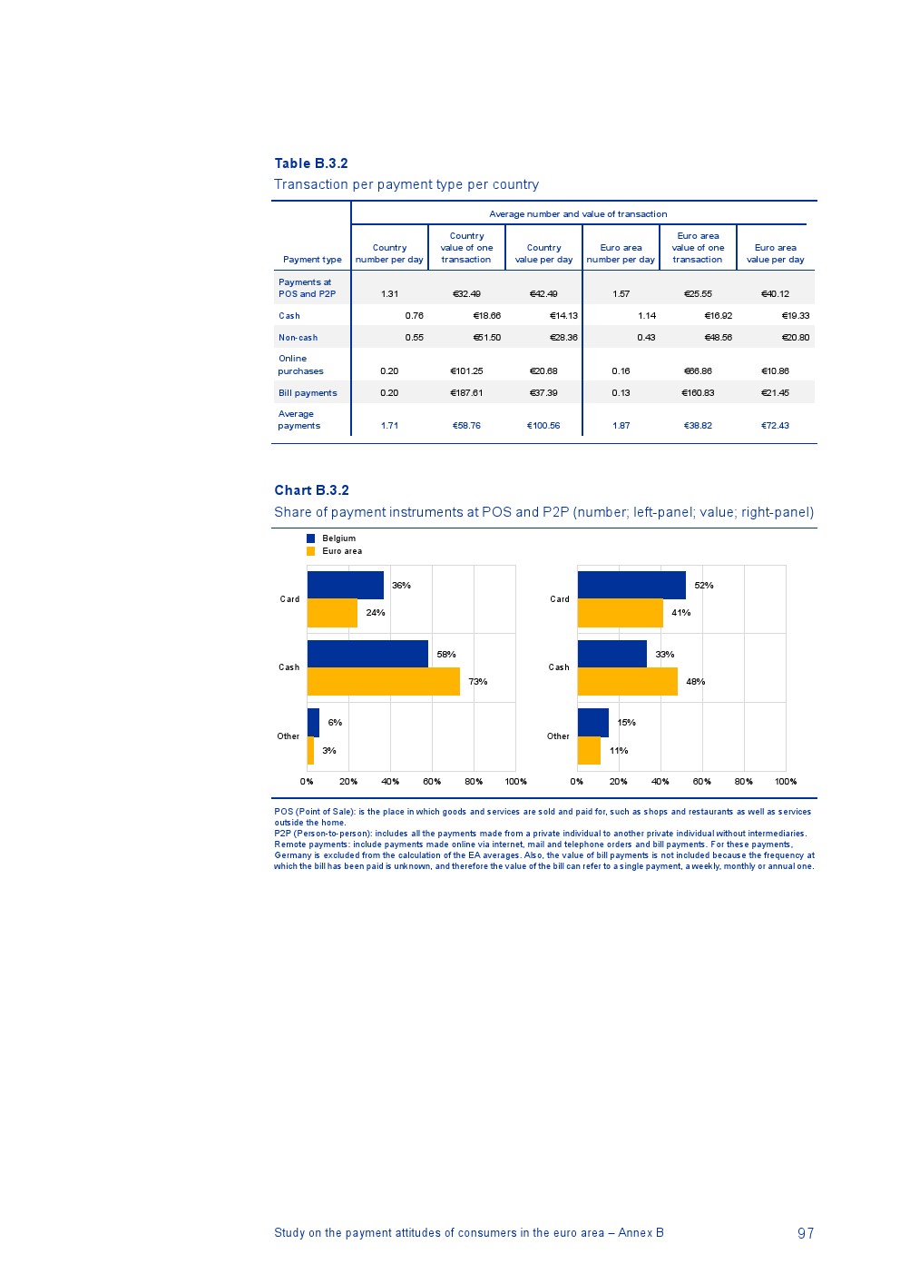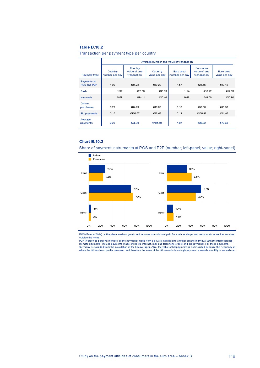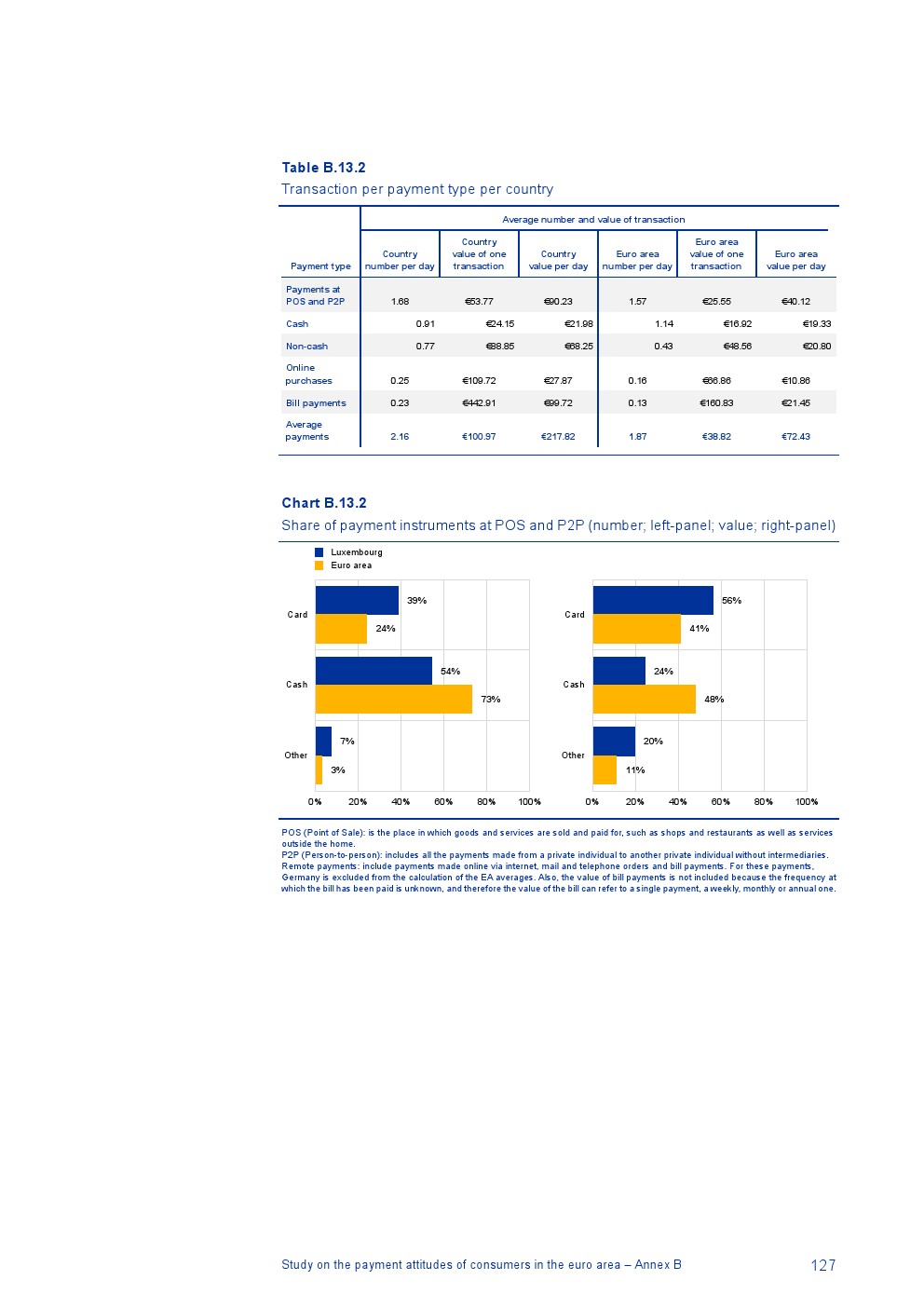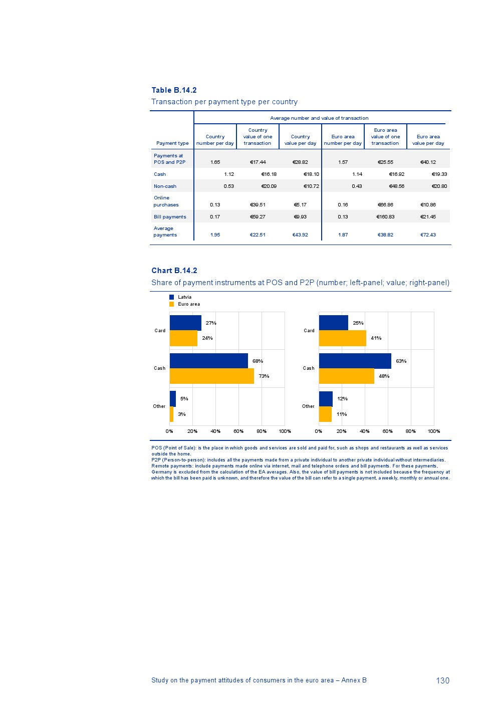 消费者主要使用现金进行销售点(POS)和个人对个人支付(P2P):73%的POS和P2P交易使用现金,27%使用非现金支付工具;按价值计算,现金交易占所有交易的48%,而信用卡交易占41%;信用卡是主要的非现金支付工具(24%);38%的卡交易使用非接触式技术;欧元区公民平均每天进行1.6笔POS和P2P交易,平均交易额为25.6欧元;48%的POS和P2P交易是在当地商店进行的日常零售购买,19%的POS和P2P交易是在餐馆、酒吧、咖啡馆和酒店进行的。4%的在线交易是用现金支付的