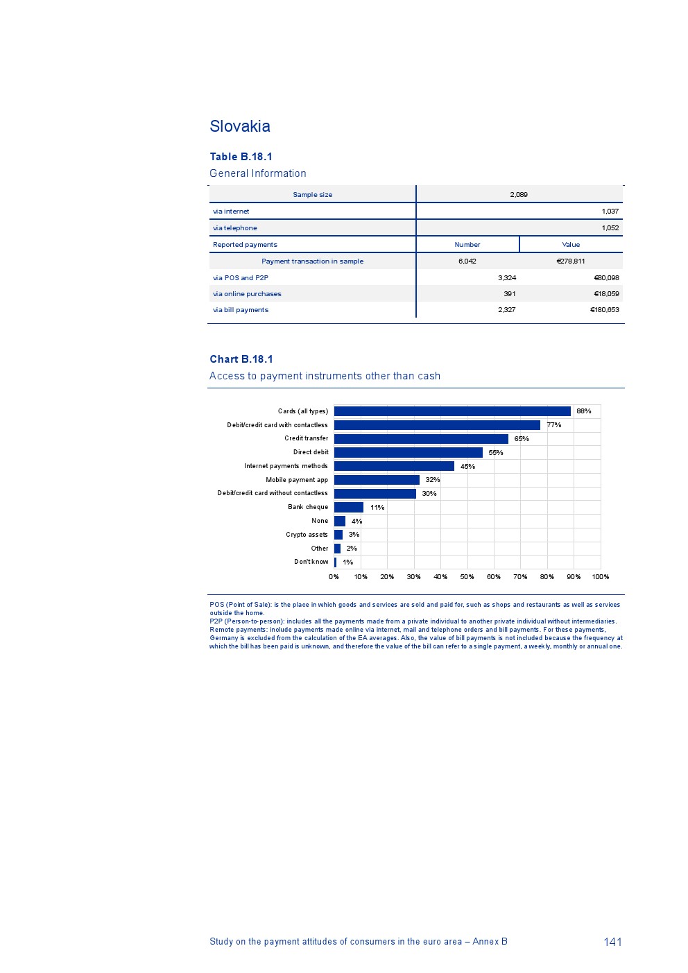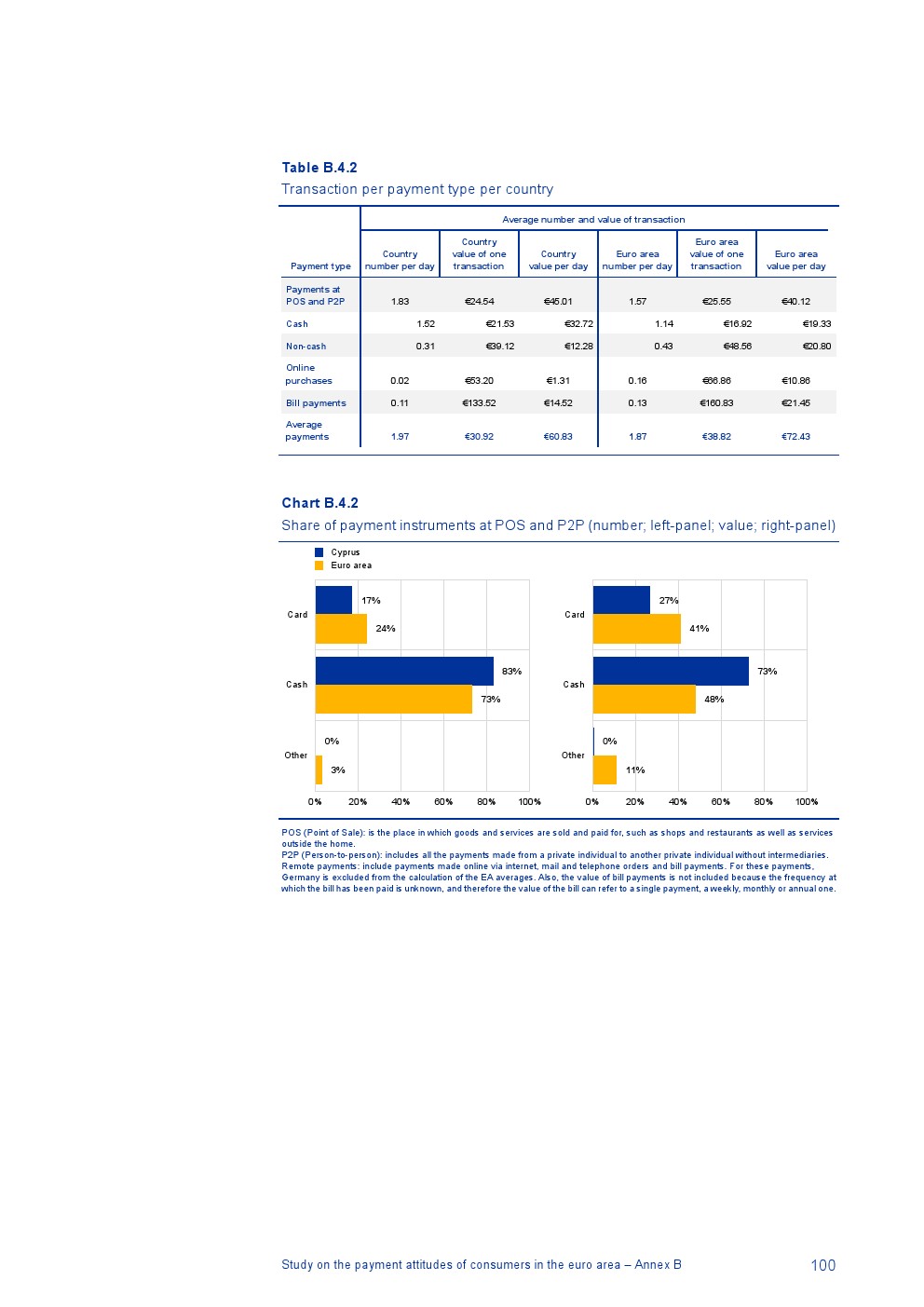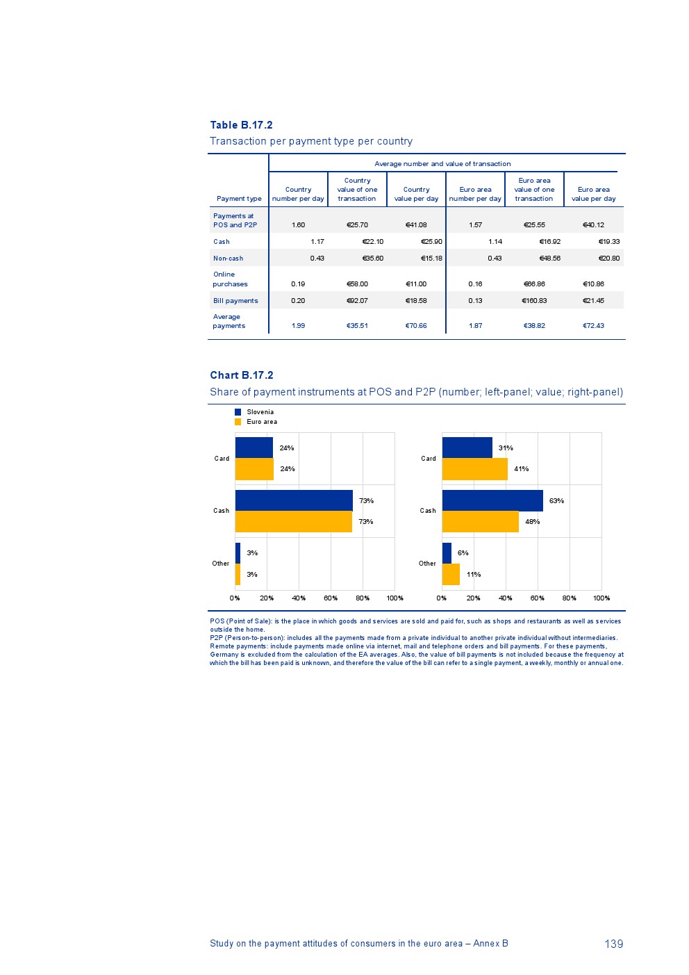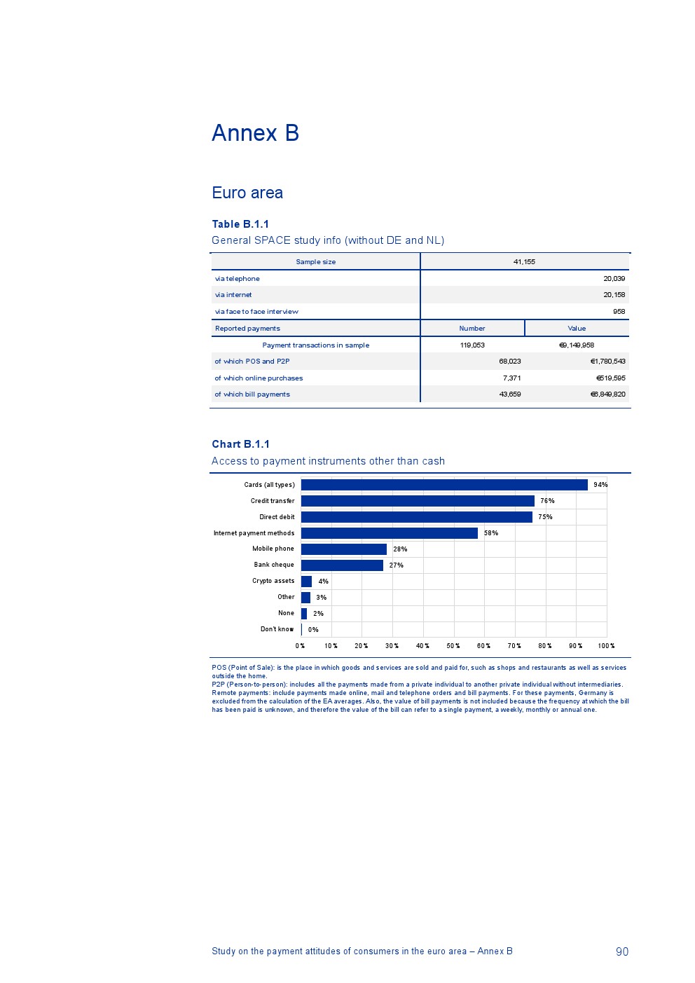 消费者主要使用现金进行销售点(POS)和个人对个人支付(P2P):73%的POS和P2P交易使用现金,27%使用非现金支付工具;按价值计算,现金交易占所有交易的48%,而信用卡交易占41%;信用卡是主要的非现金支付工具(24%);38%的卡交易使用非接触式技术;欧元区公民平均每天进行1.6笔POS和P2P交易,平均交易额为25.6欧元;48%的POS和P2P交易是在当地商店进行的日常零售购买,19%的POS和P2P交易是在餐馆、酒吧、咖啡馆和酒店进行的。4%的在线交易是用现金支付的