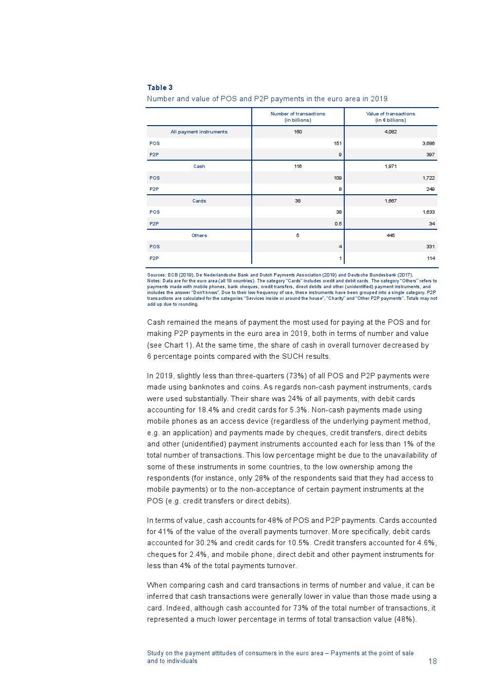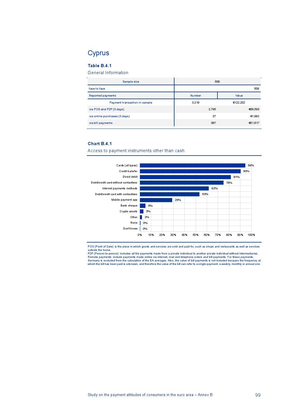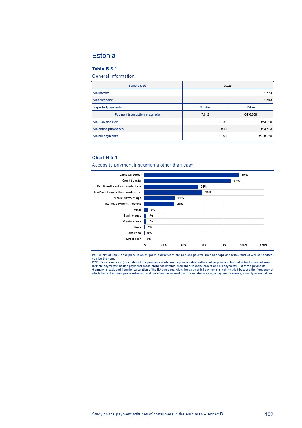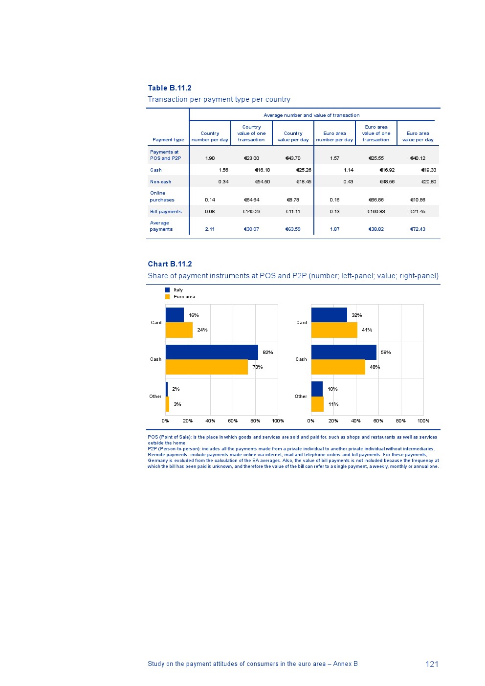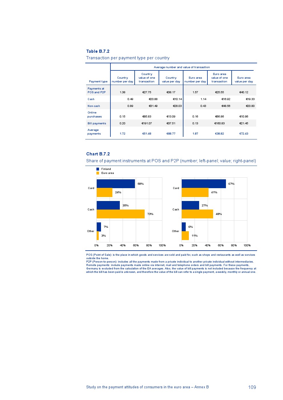 消费者主要使用现金进行销售点(POS)和个人对个人支付(P2P):73%的POS和P2P交易使用现金,27%使用非现金支付工具;按价值计算,现金交易占所有交易的48%,而信用卡交易占41%;信用卡是主要的非现金支付工具(24%);38%的卡交易使用非接触式技术;欧元区公民平均每天进行1.6笔POS和P2P交易,平均交易额为25.6欧元;48%的POS和P2P交易是在当地商店进行的日常零售购买,19%的POS和P2P交易是在餐馆、酒吧、咖啡馆和酒店进行的。4%的在线交易是用现金支付的