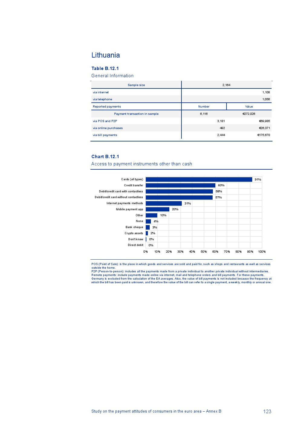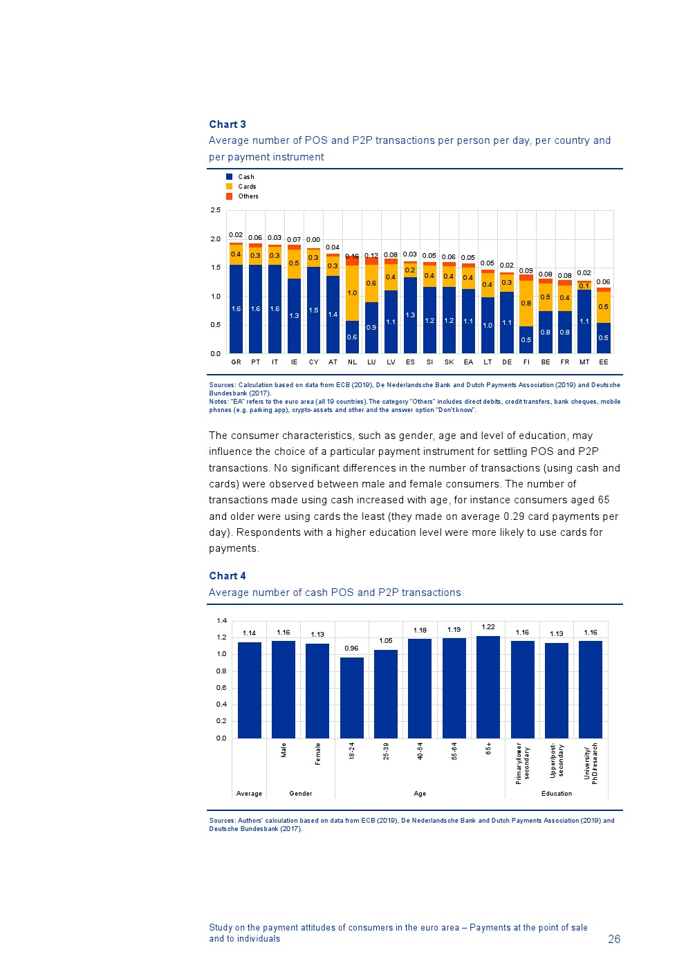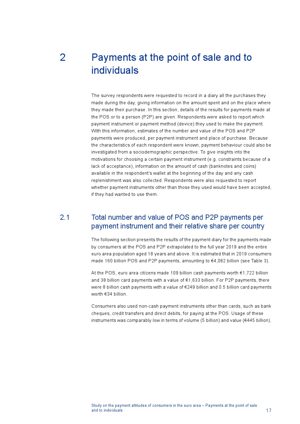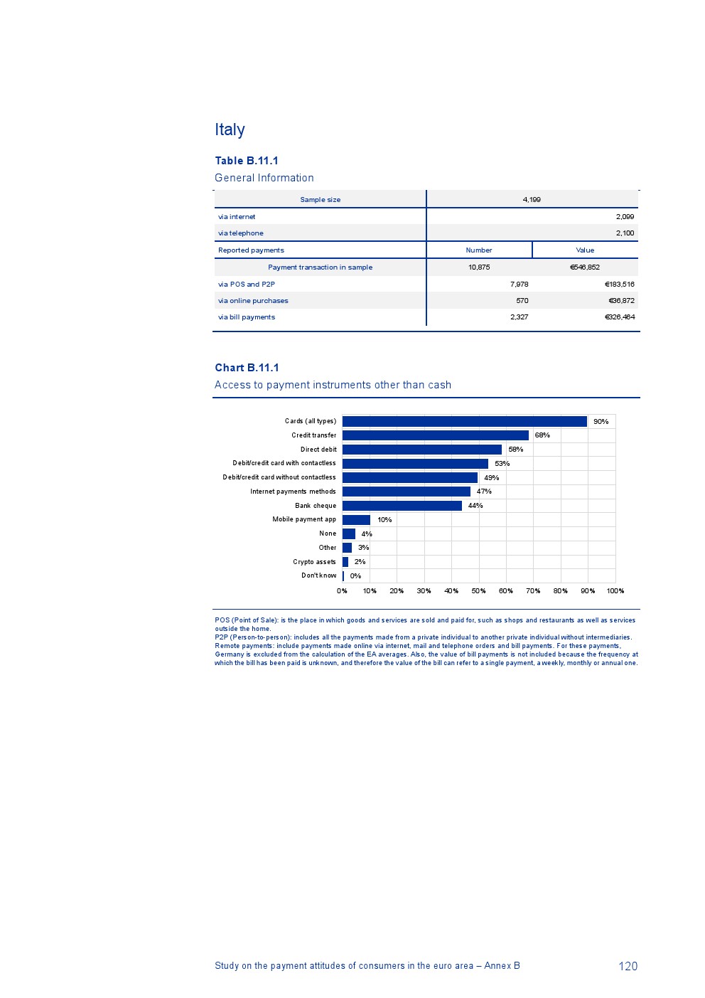 消费者主要使用现金进行销售点(POS)和个人对个人支付(P2P):73%的POS和P2P交易使用现金,27%使用非现金支付工具;按价值计算,现金交易占所有交易的48%,而信用卡交易占41%;信用卡是主要的非现金支付工具(24%);38%的卡交易使用非接触式技术;欧元区公民平均每天进行1.6笔POS和P2P交易,平均交易额为25.6欧元;48%的POS和P2P交易是在当地商店进行的日常零售购买,19%的POS和P2P交易是在餐馆、酒吧、咖啡馆和酒店进行的。4%的在线交易是用现金支付的