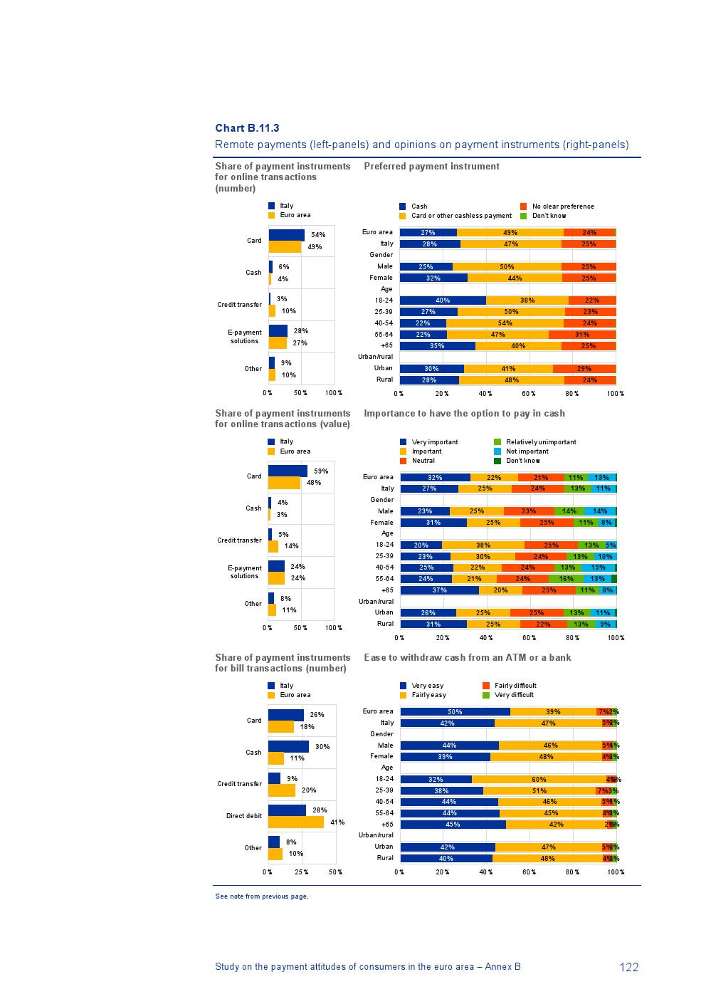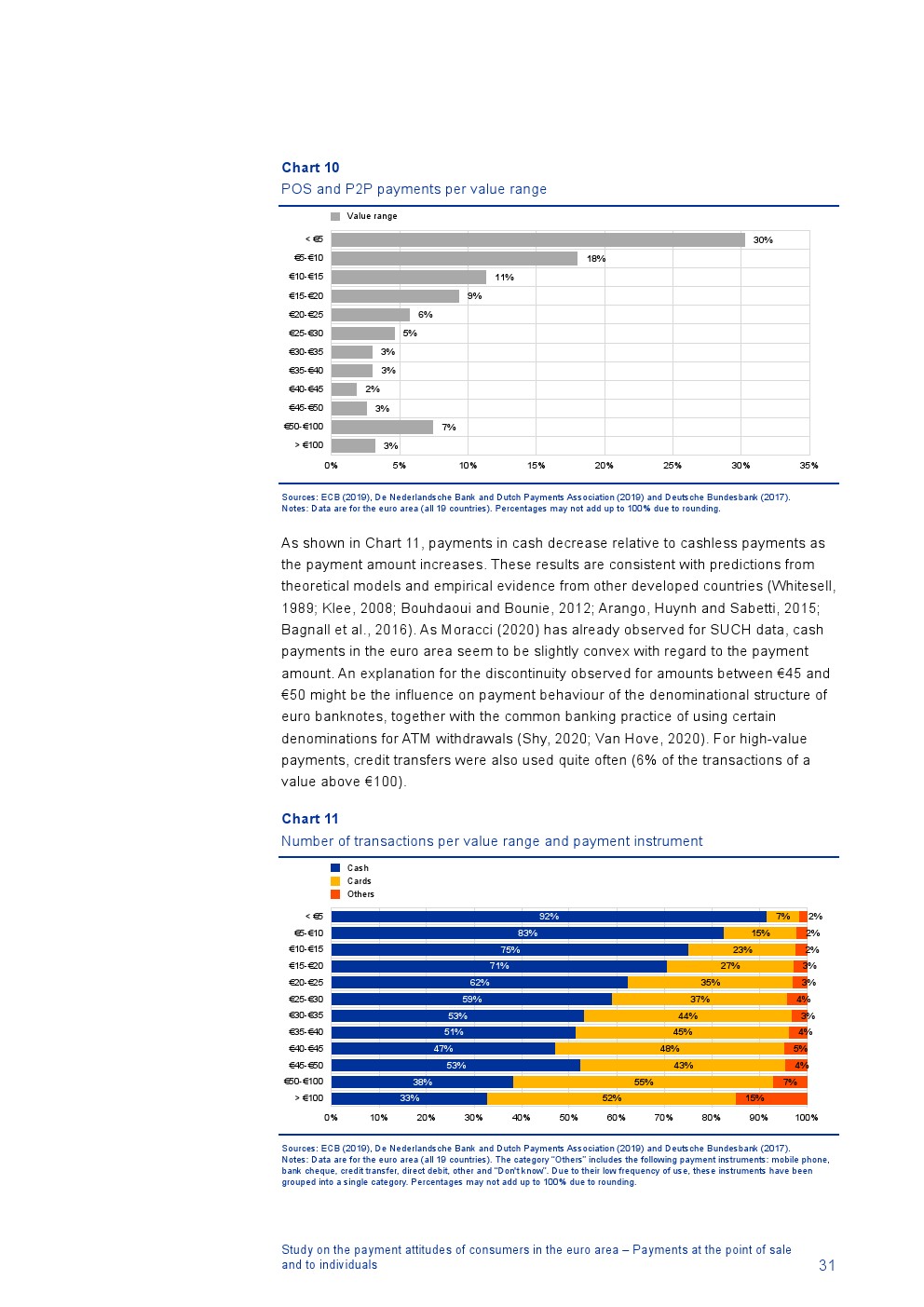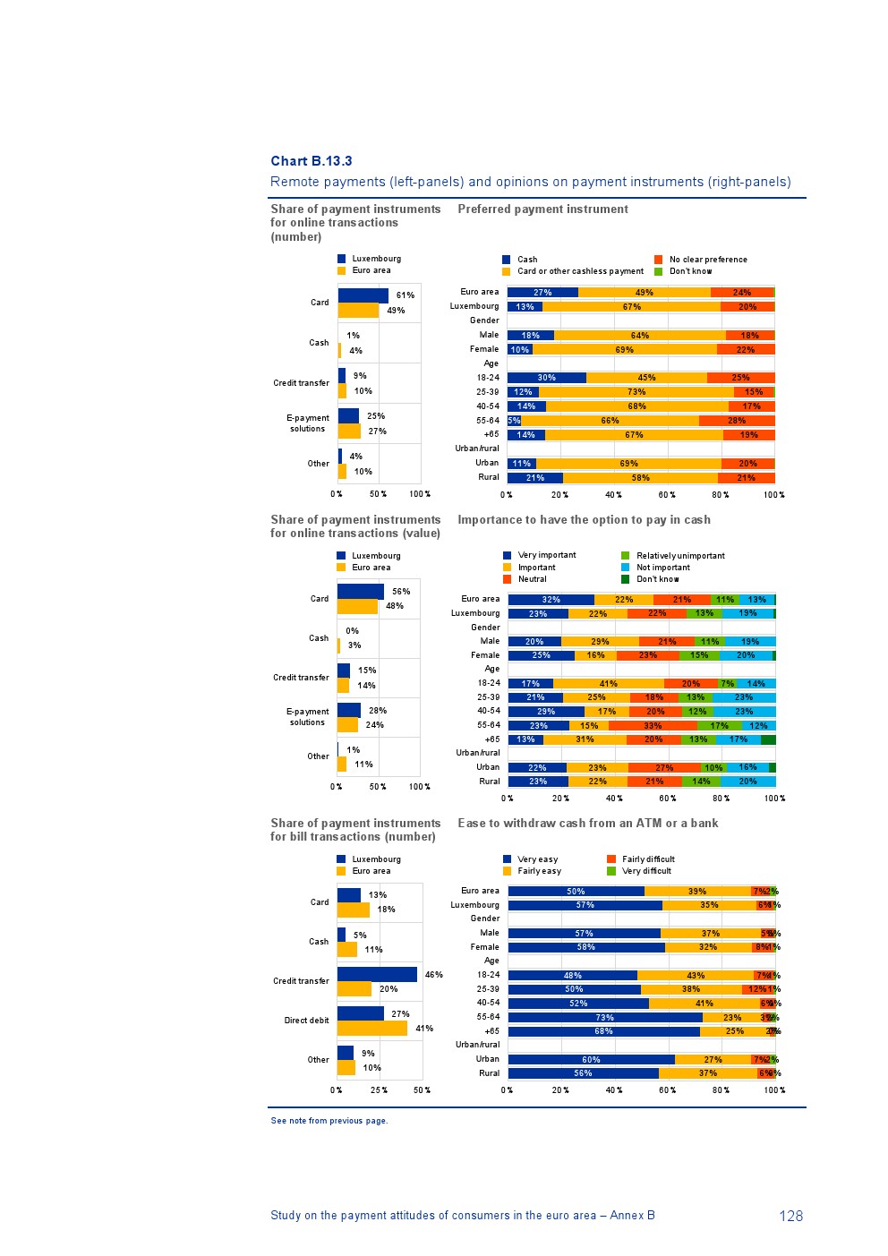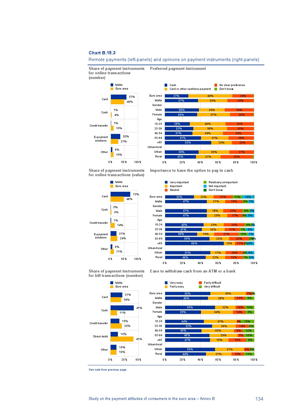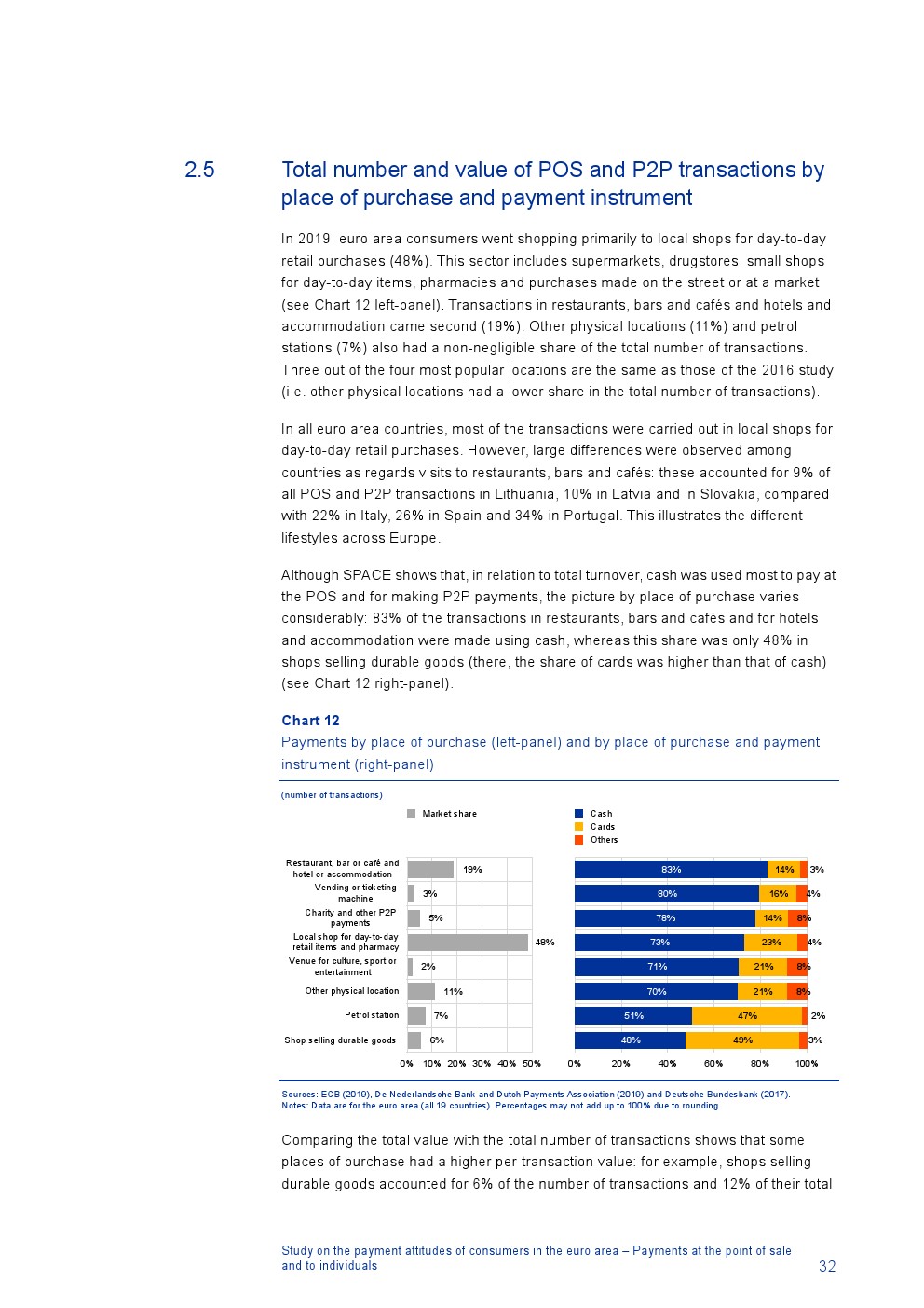 消费者主要使用现金进行销售点(POS)和个人对个人支付(P2P):73%的POS和P2P交易使用现金,27%使用非现金支付工具;按价值计算,现金交易占所有交易的48%,而信用卡交易占41%;信用卡是主要的非现金支付工具(24%);38%的卡交易使用非接触式技术;欧元区公民平均每天进行1.6笔POS和P2P交易,平均交易额为25.6欧元;48%的POS和P2P交易是在当地商店进行的日常零售购买,19%的POS和P2P交易是在餐馆、酒吧、咖啡馆和酒店进行的。4%的在线交易是用现金支付的