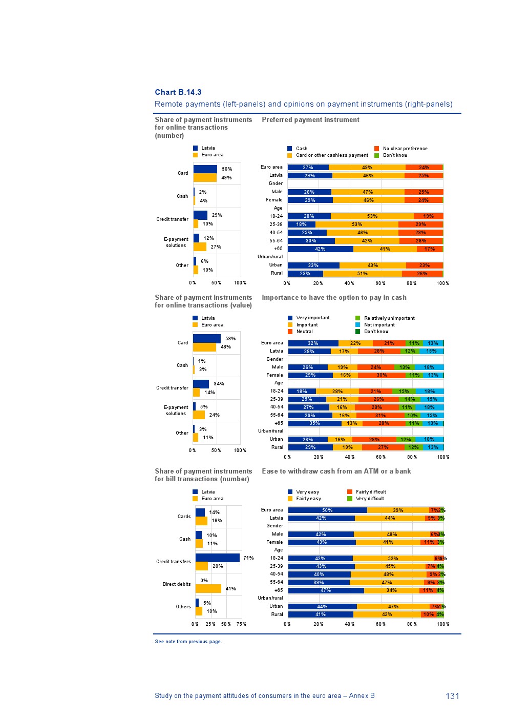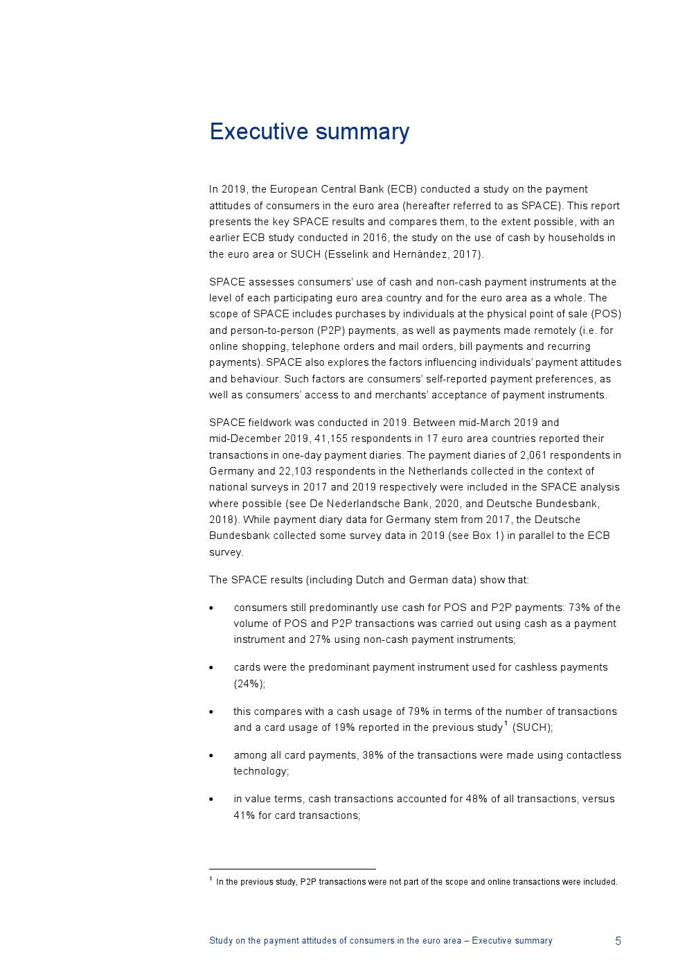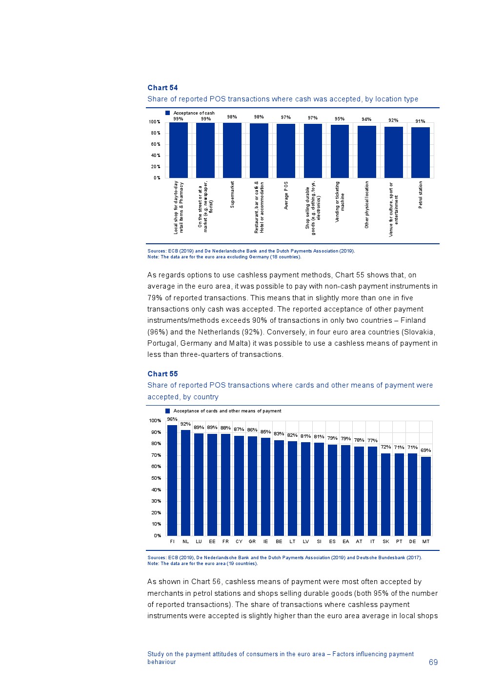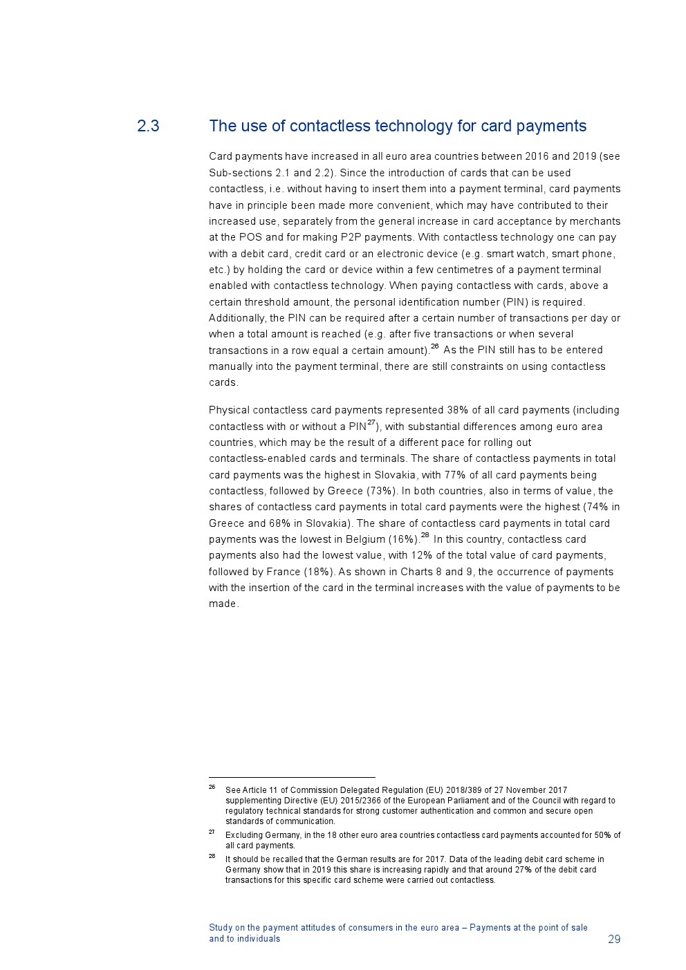 消费者主要使用现金进行销售点(POS)和个人对个人支付(P2P):73%的POS和P2P交易使用现金,27%使用非现金支付工具;按价值计算,现金交易占所有交易的48%,而信用卡交易占41%;信用卡是主要的非现金支付工具(24%);38%的卡交易使用非接触式技术;欧元区公民平均每天进行1.6笔POS和P2P交易,平均交易额为25.6欧元;48%的POS和P2P交易是在当地商店进行的日常零售购买,19%的POS和P2P交易是在餐馆、酒吧、咖啡馆和酒店进行的。4%的在线交易是用现金支付的
