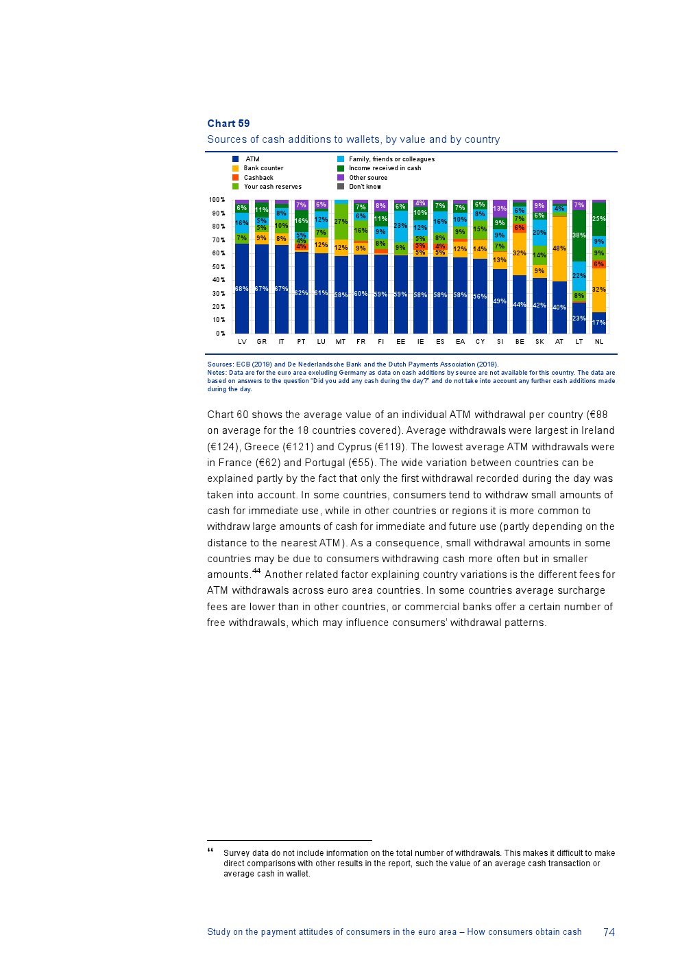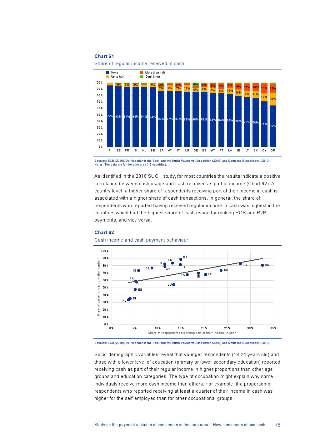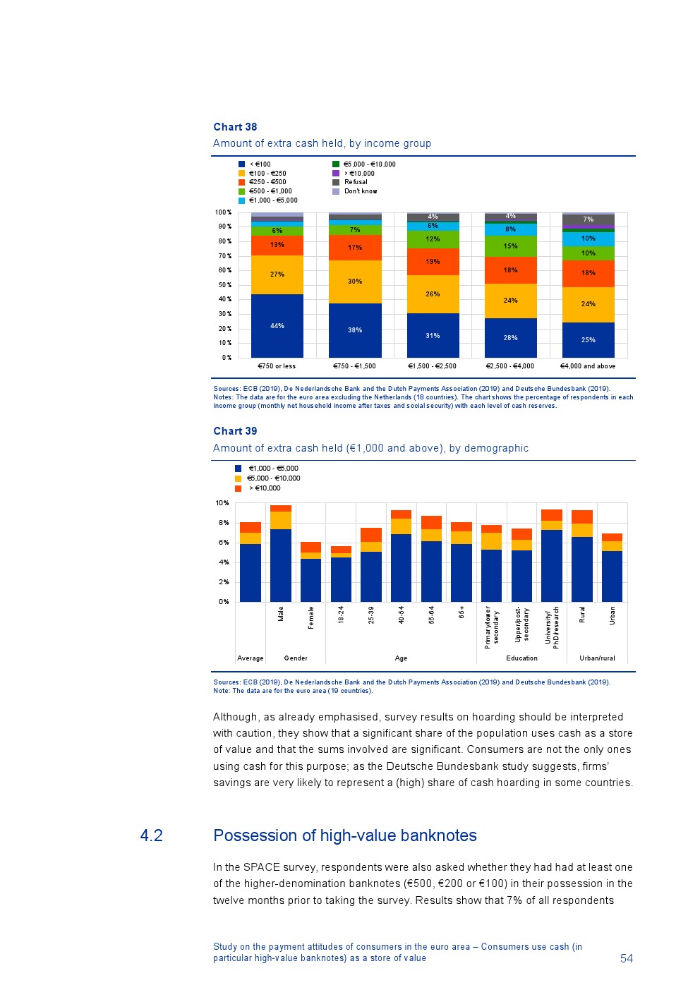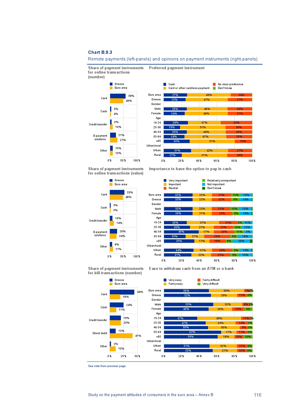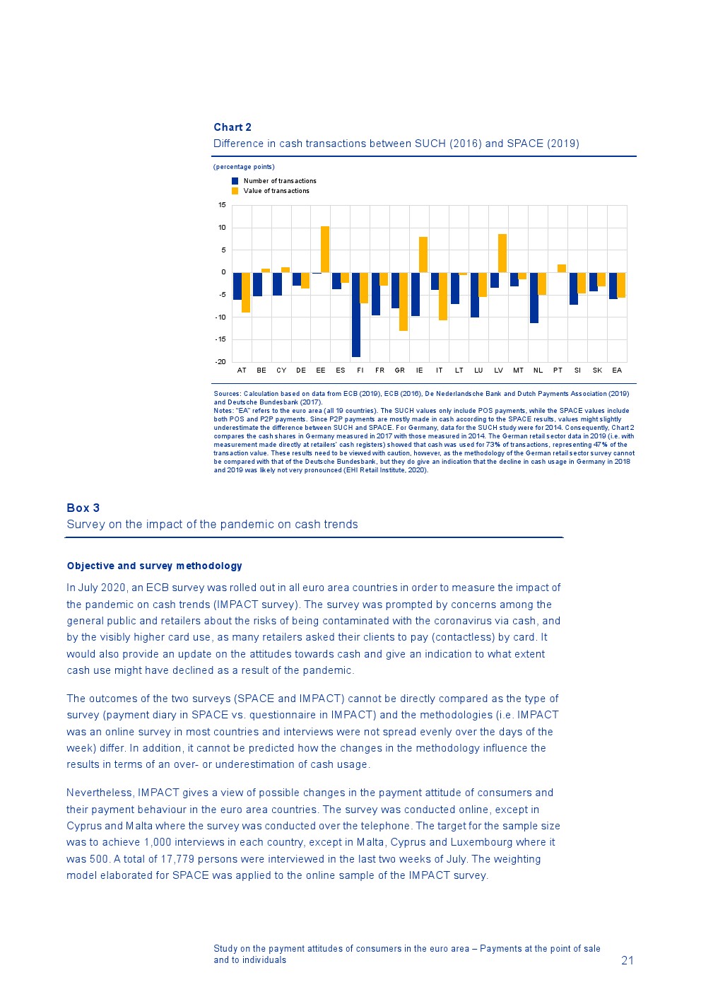 消费者主要使用现金进行销售点(POS)和个人对个人支付(P2P):73%的POS和P2P交易使用现金,27%使用非现金支付工具;按价值计算,现金交易占所有交易的48%,而信用卡交易占41%;信用卡是主要的非现金支付工具(24%);38%的卡交易使用非接触式技术;欧元区公民平均每天进行1.6笔POS和P2P交易,平均交易额为25.6欧元;48%的POS和P2P交易是在当地商店进行的日常零售购买,19%的POS和P2P交易是在餐馆、酒吧、咖啡馆和酒店进行的。4%的在线交易是用现金支付的