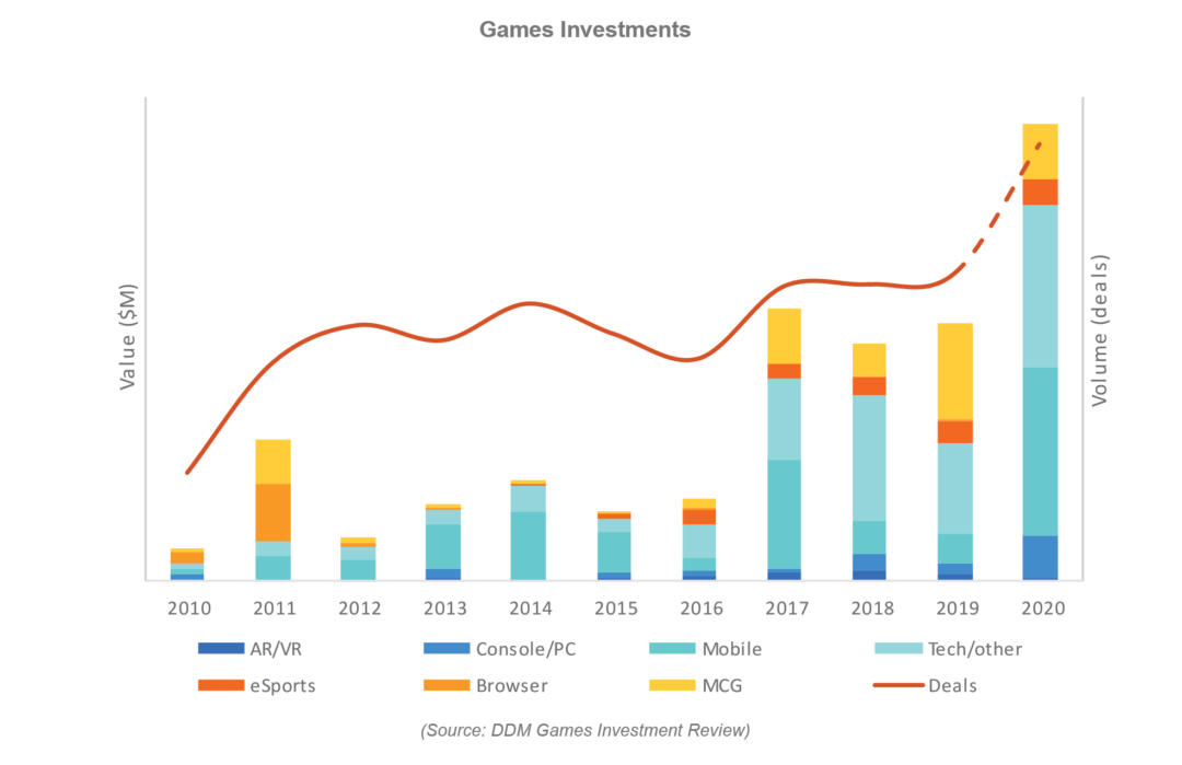 2020年游戏投资总额为132亿美元,比2019年增长了77%。共完成超过400笔投资,交易量同比增长了42%,创下了另一个纪录。