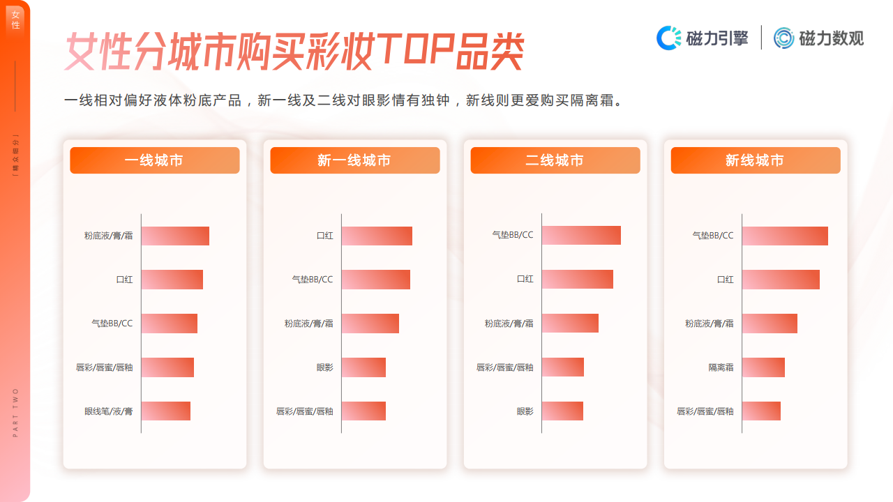 ◾用户活跃:快手彩妆用户活跃,爱看彩妆内容,喜搜彩妆品牌和教程推荐◾消费爆发:购买力持续释放,消费增势猛◾健康生态:彩妆全品类消费高速增长,呈现可持续发展的驱动型产品结构◾女性是核心人群并保持稳定增长,高线女性购买力强且增速高◾Z世代精致领先,粉底、眼影、口红是最爱