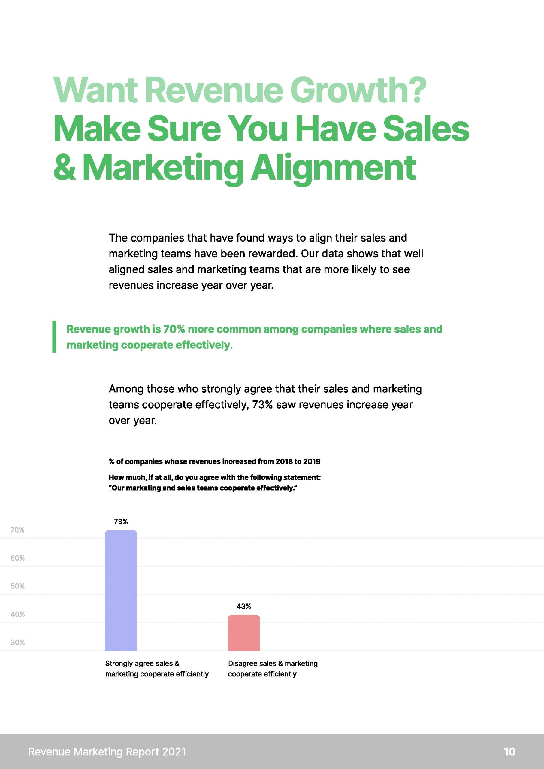 3、具有无缝销售和营销协作的公司比没有有效协调的公司更有可能实现收入增长。有效合作的公司收入增长率高出70%。最佳的合作形式是两个团队在战略和战术举措上进行合作,如高管认同、定期联席会议和共享KPI。
