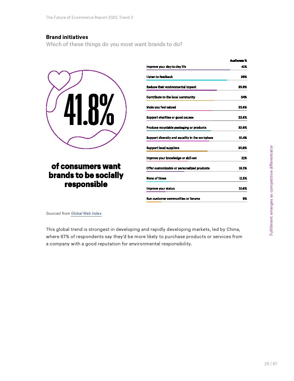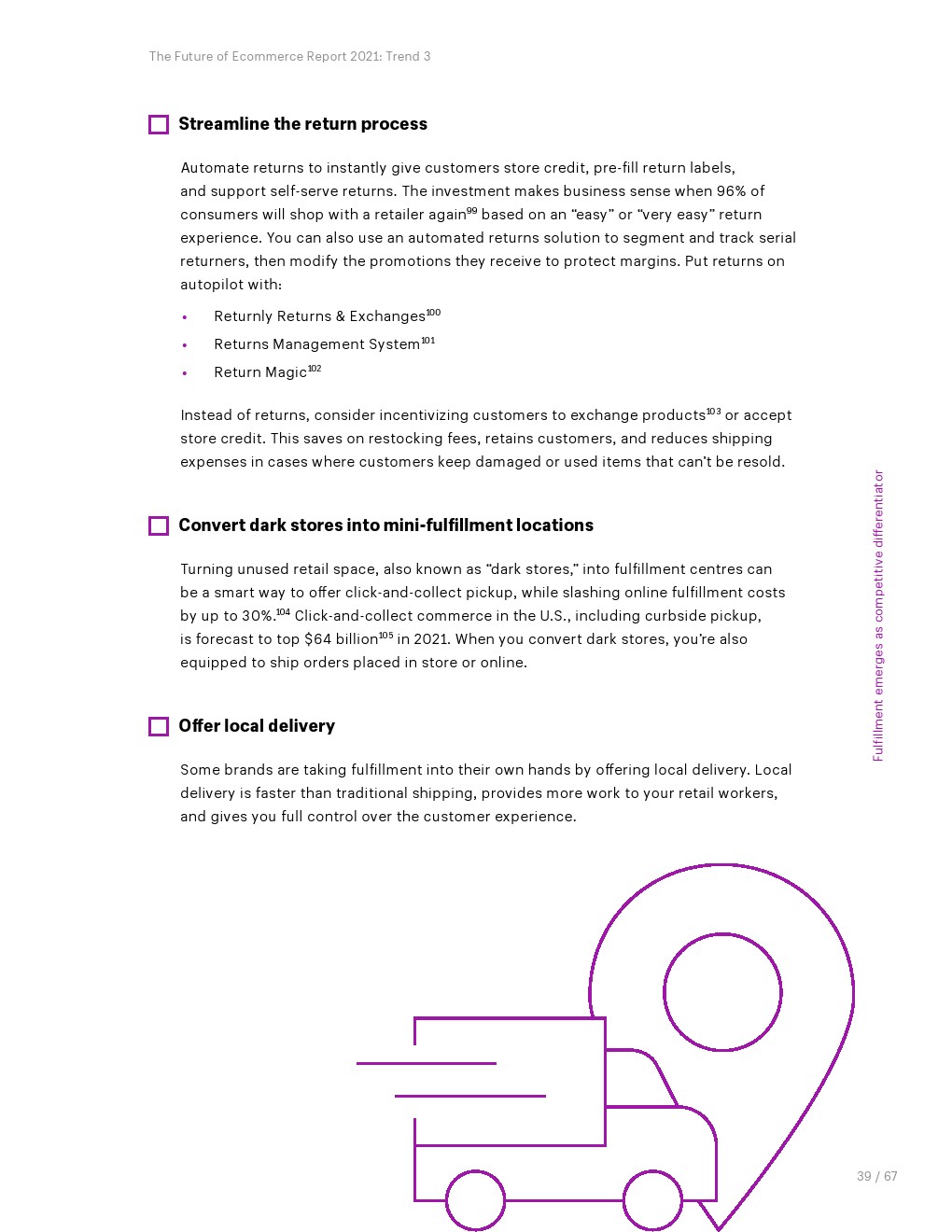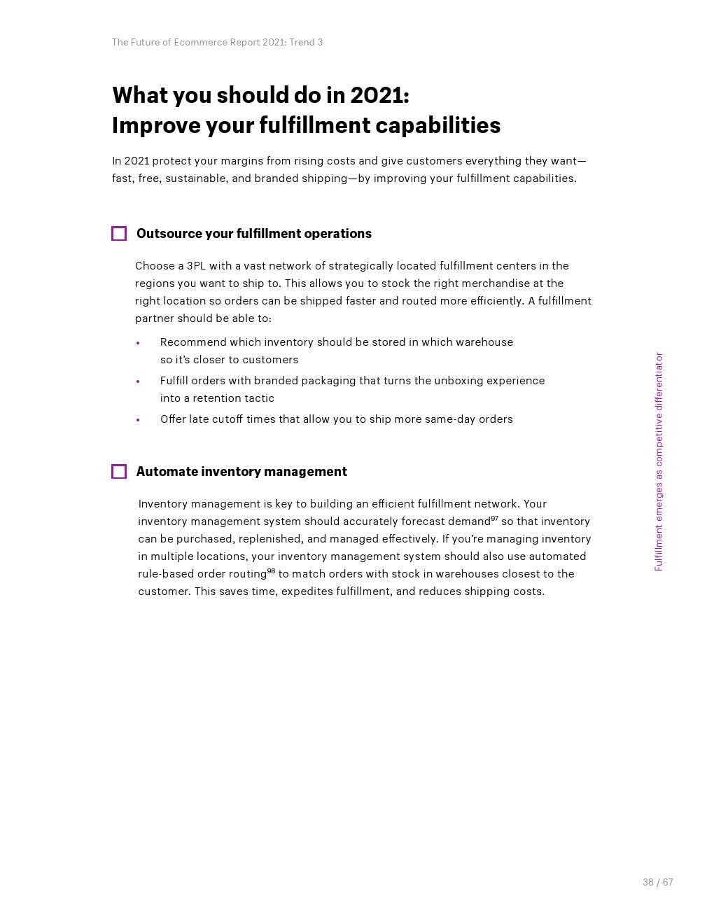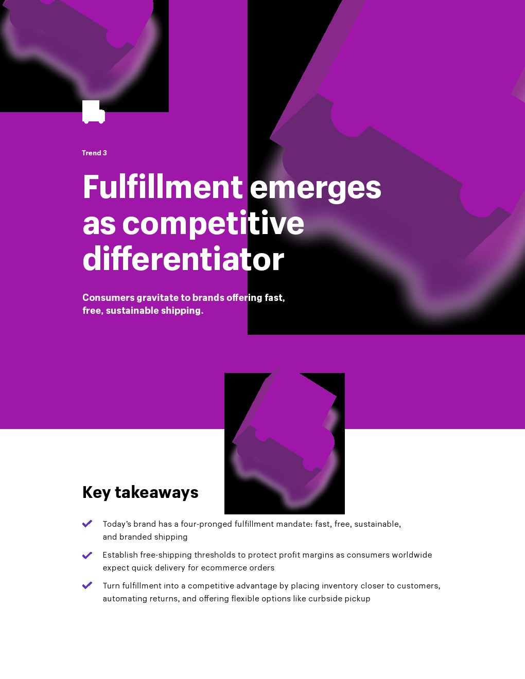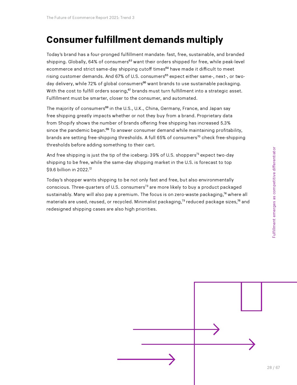 现在的品牌有四个方面的任务:快速、免费、可持续和品牌运输。在全球范围内,64%的消费者希望他们的订单可以免费发货,而高峰级别的电子商务和严格的发货截止时间使得他们很难满足不断增长的客户需求。67%的美国消费者希望当天、次日或两天交货;72%的全球消费者希望品牌使用可持续包装。随着完成订单的成本飙升,品牌必须将完成订单转化为战略资产。履行必须更智能、更贴近消费者和自动化。