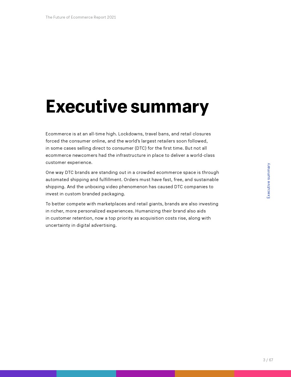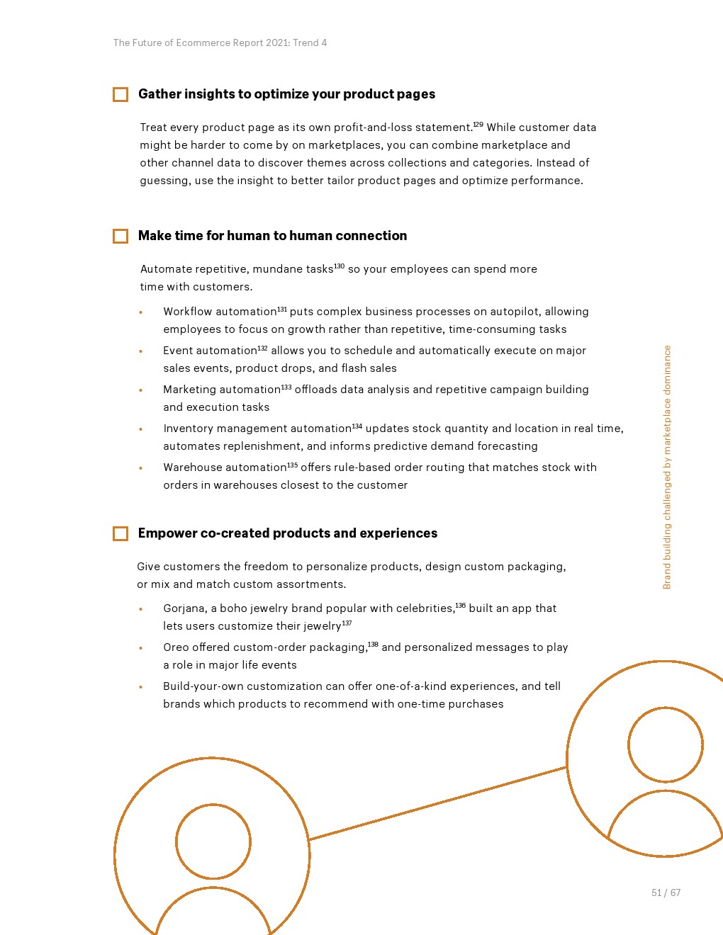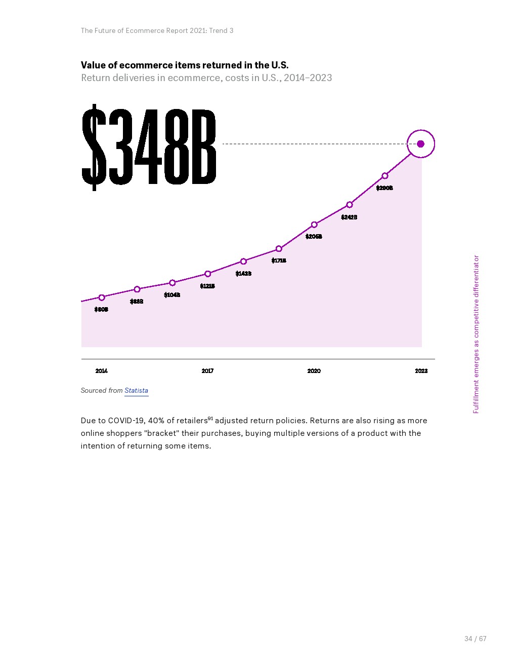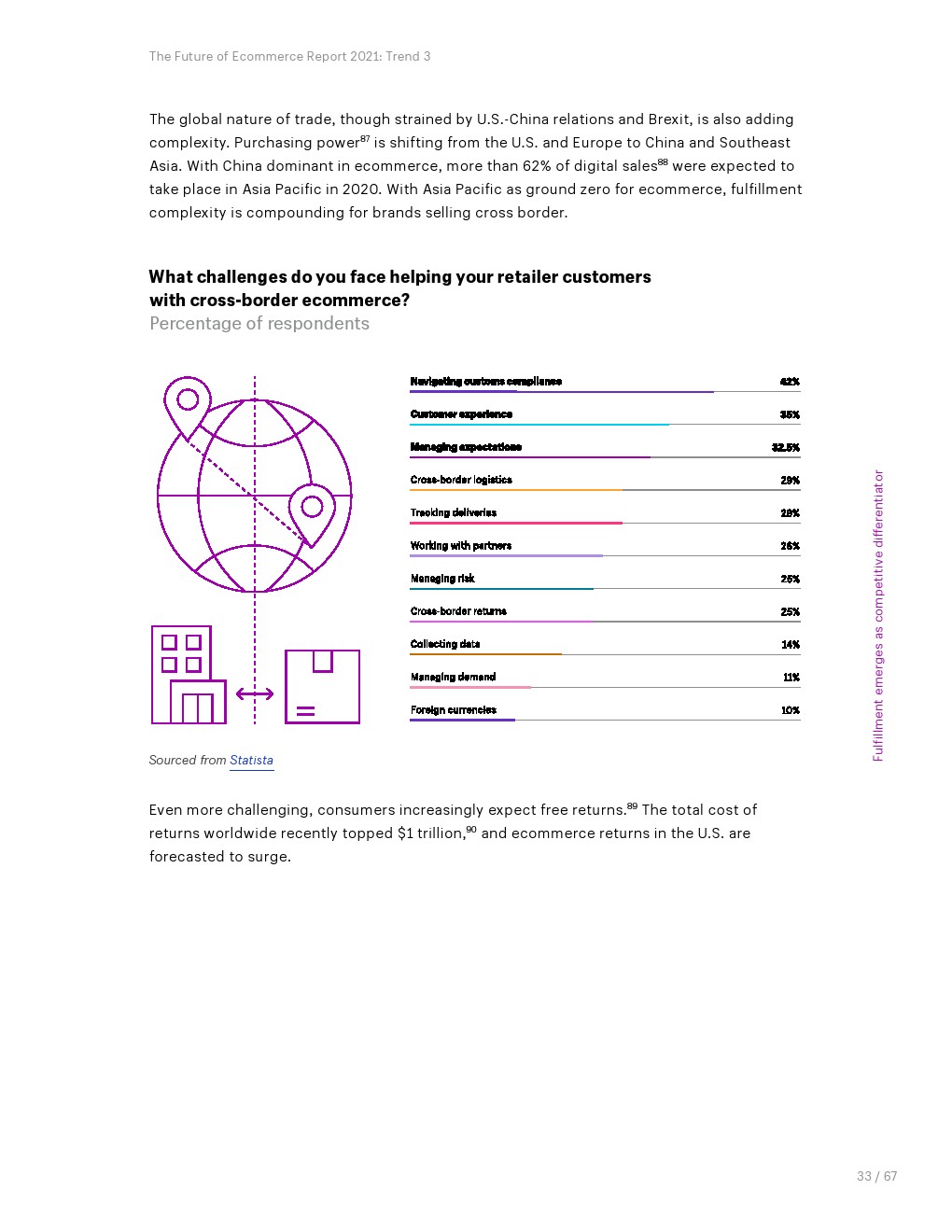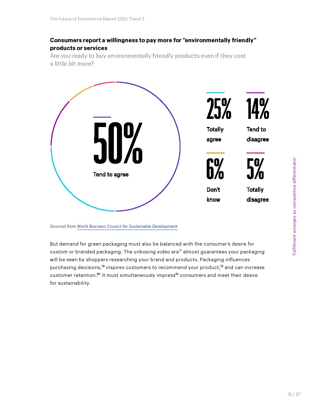 现在的品牌有四个方面的任务:快速、免费、可持续和品牌运输。在全球范围内,64%的消费者希望他们的订单可以免费发货,而高峰级别的电子商务和严格的发货截止时间使得他们很难满足不断增长的客户需求。67%的美国消费者希望当天、次日或两天交货;72%的全球消费者希望品牌使用可持续包装。随着完成订单的成本飙升,品牌必须将完成订单转化为战略资产。履行必须更智能、更贴近消费者和自动化。