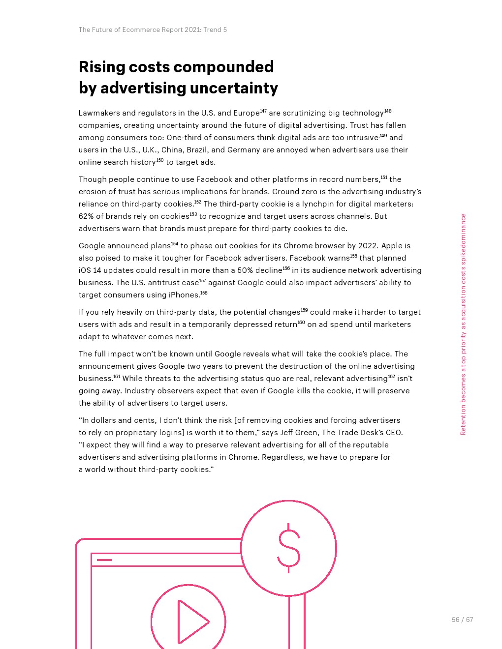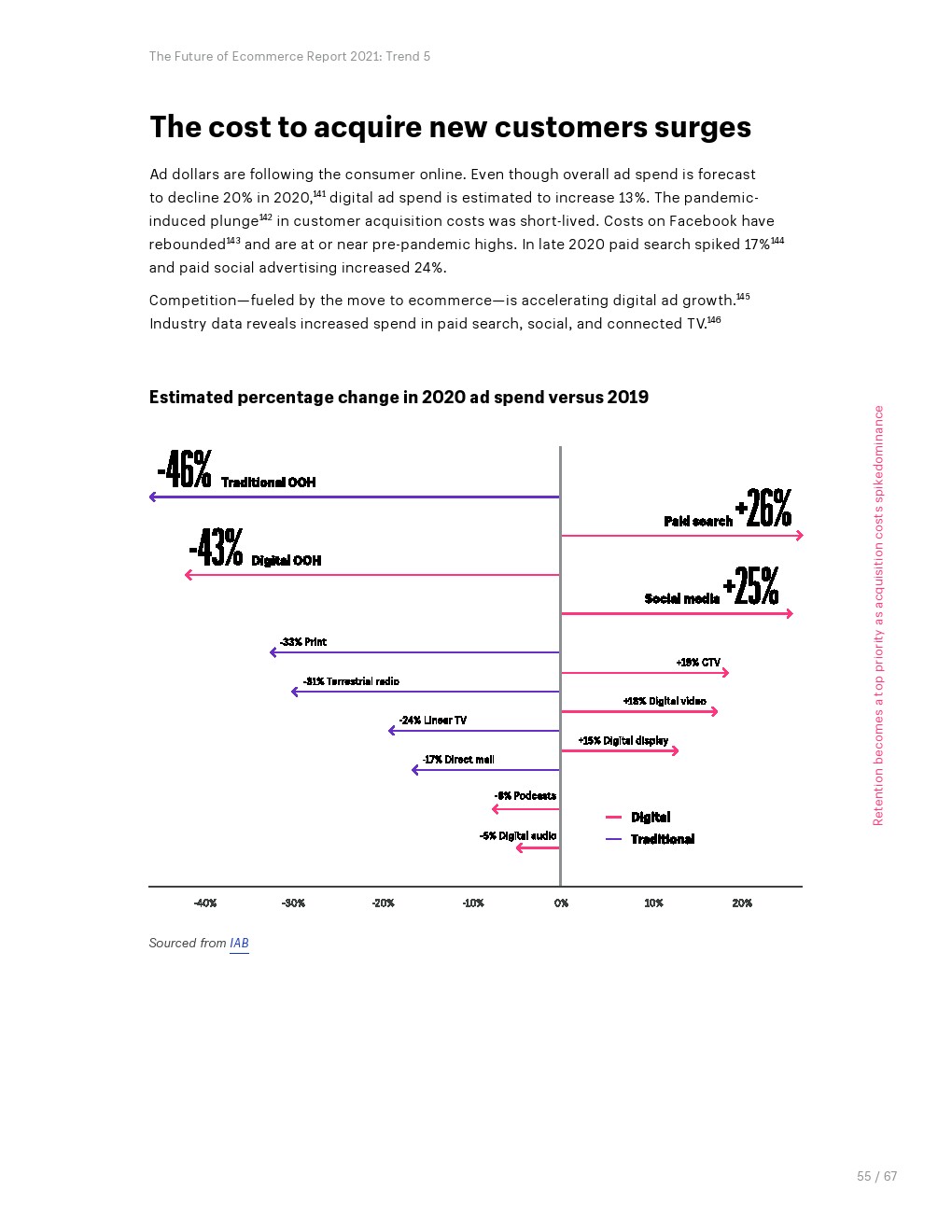 预计2020年整体广告支出下降20%,但数字广告支出仍增长13%。大流行引起的新客户获取成本暴跌是短暂的。Facebook的成本已经反弹,并达到或接近大流行前的高点。2020年末,付费搜索广告成本增长了17%,付费社交广告增长了24%。