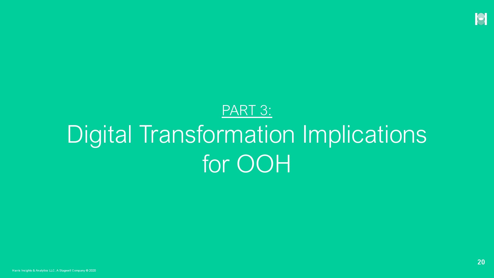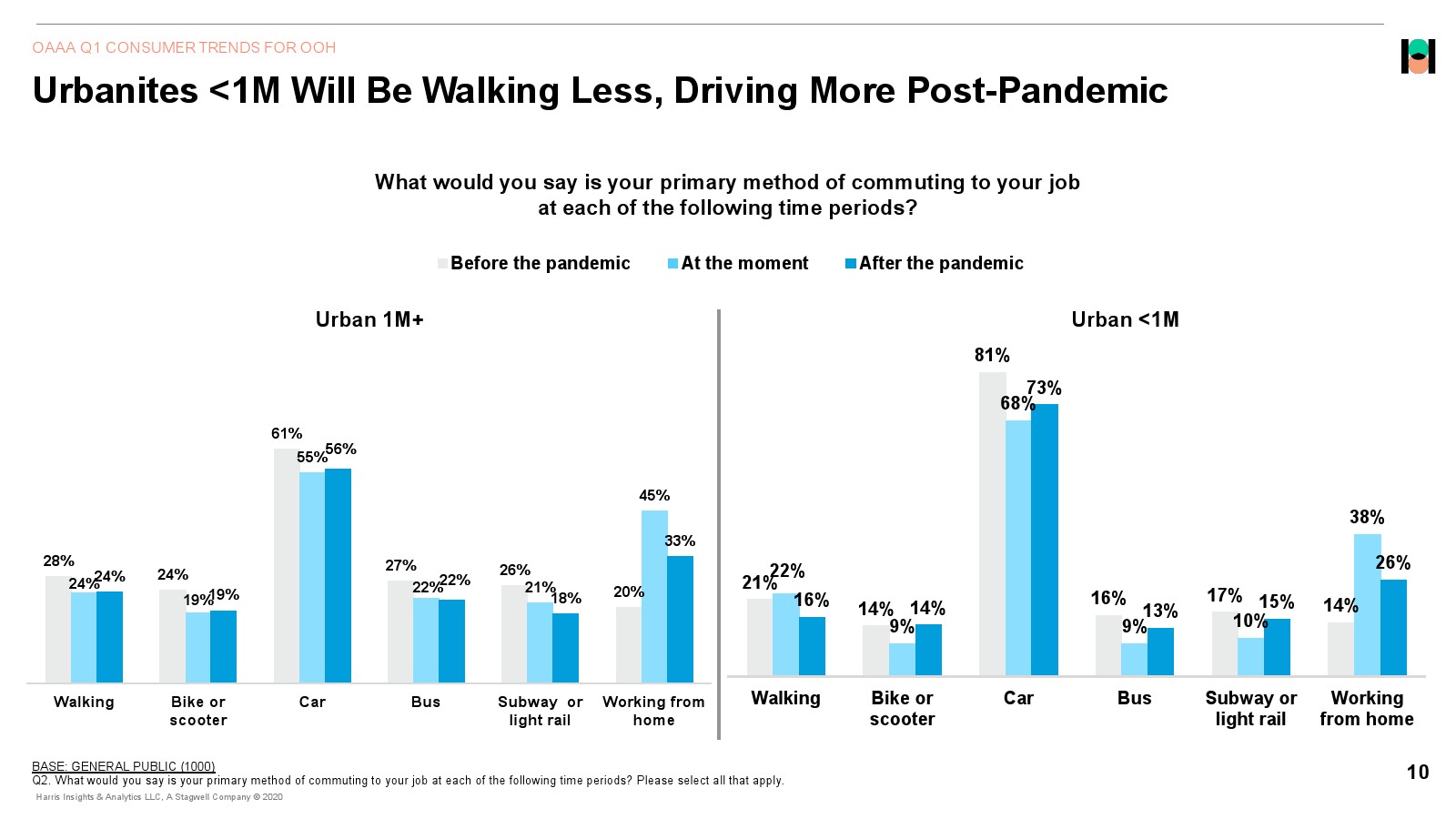 大多数(63%)的人会开车去上班。尽管如此,自新冠肺炎大流行以来,开车上下班的人的比例已经下降(74%),这可能是2020年OOH收入急剧下降的部分原因。