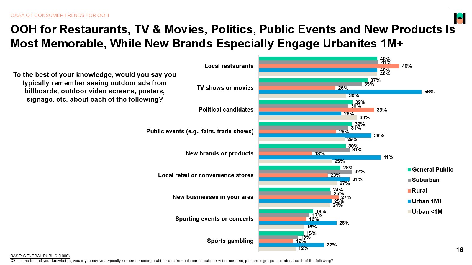 也就是说,很少有人会记得当地零售店或便利店的OOH广告(28%)、该地区的新企业(24%)或体育赛事和音乐会(19%)。