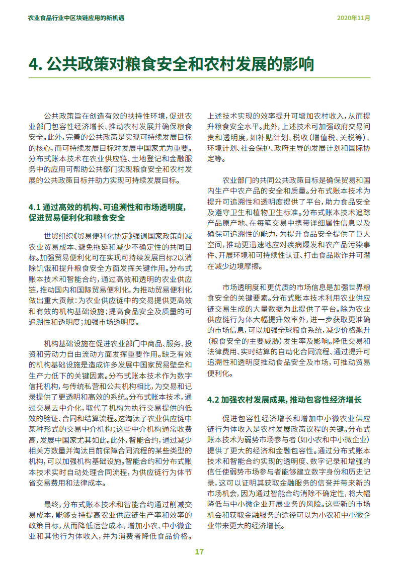 本文旨在推动深化对农业食品中分布式账本技术机遇、效益和应用的认识,探讨了分布式账本技术通过让弱势市场主体参与一体化供应链,对于解决其诸多挑战的潜力。还明确了采用分布式账本技术的技术局限性、可能的机构障碍以及公共部门的下一步工作。总而言之,本文揭示了分布式账本技术如何能够促进实现可持续发展目标。