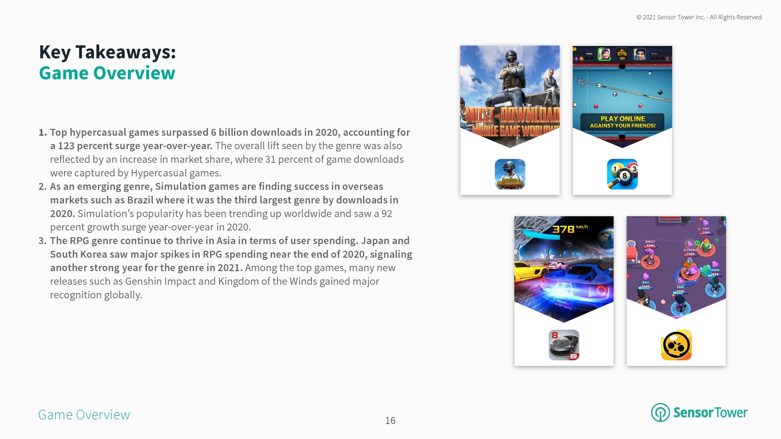 模拟游戏在诸如巴西等海外市场取得了成功, 2020年下载量排在第三位。模拟游戏的普及率在全球范围内呈上升趋势,2020年同比增长92%。