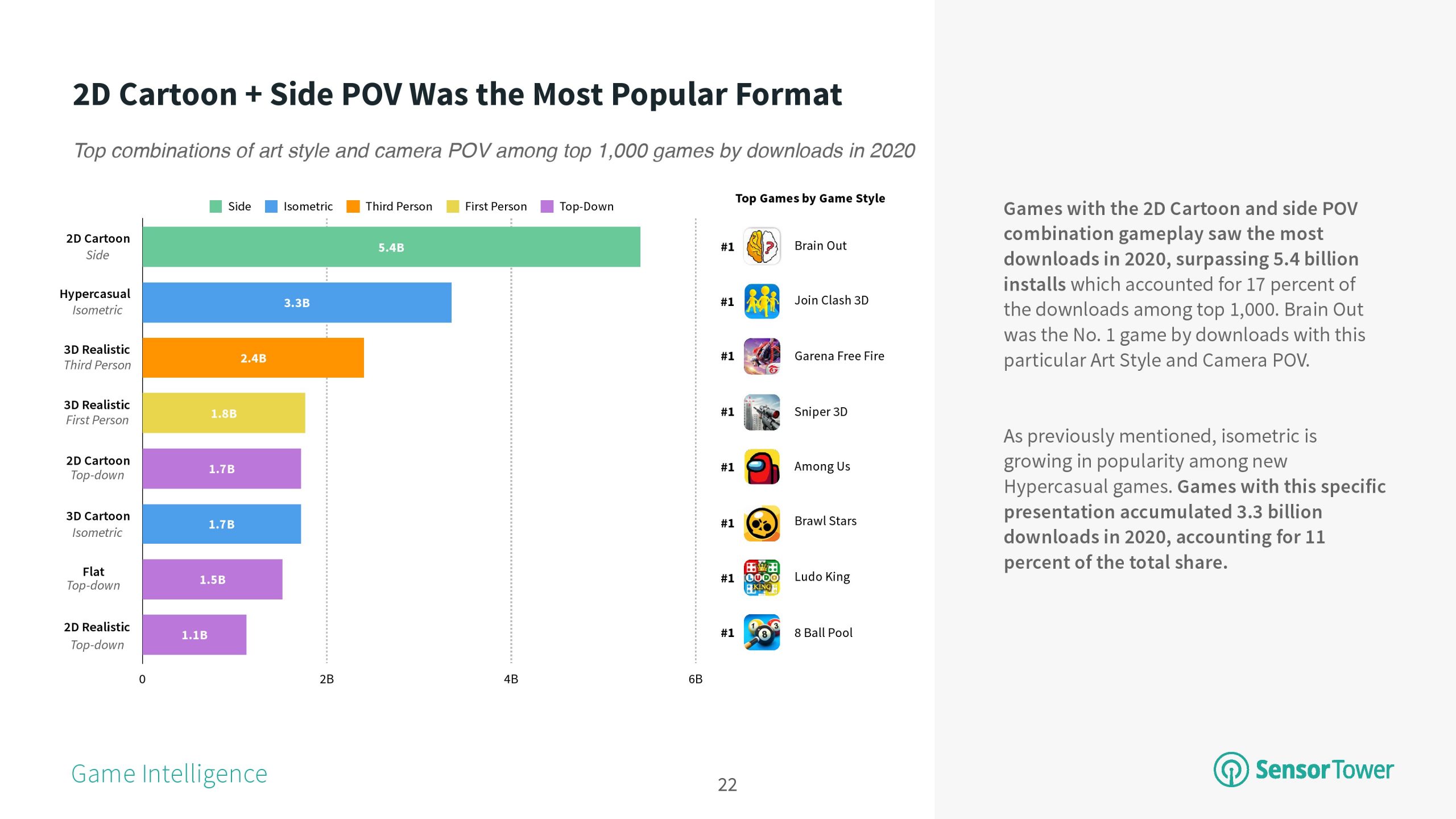 2、在新游戏版本中,等距视角游戏风格呈上升趋势,占2020年顶级游戏下载量的27%。虽然新版本似乎正在从传统视角转移,但在2020年,它仍然占下载量的28%。