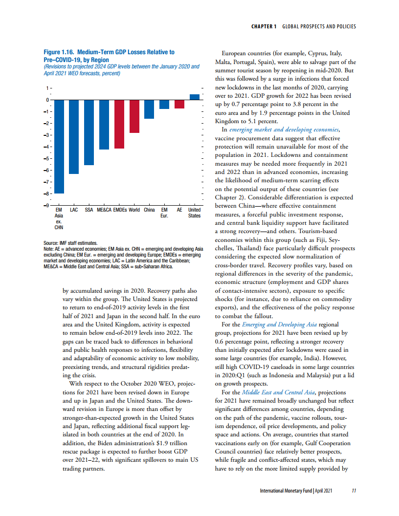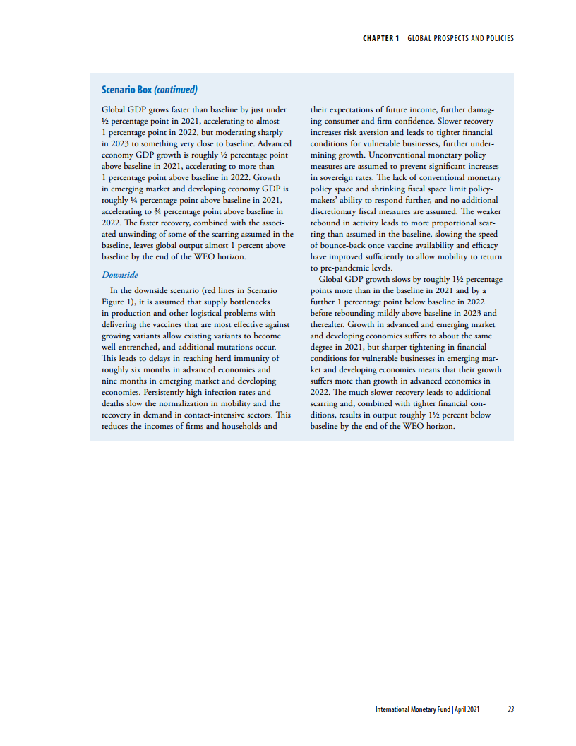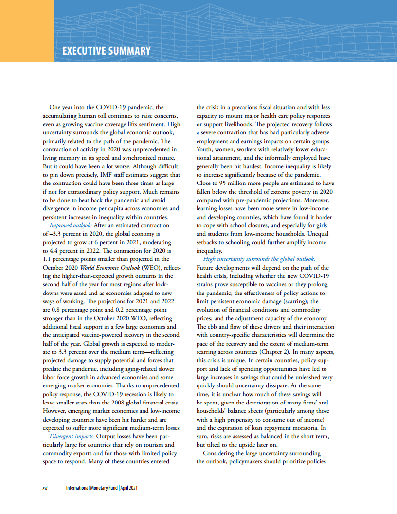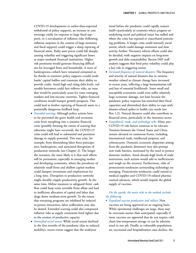 预测值的上调反映了以下因素:少数大型经济体推出了更多财政支持,2021年下半年预计出现疫苗驱动的经济复苏,以及经济活动持续对人员流动下降做出调整和适应。经济前景存在巨大的不确定性,这与新冠疫情的未来发展路径、政策支持帮助实现疫苗驱动复苏的效果以及融资环境的变化情况有关。