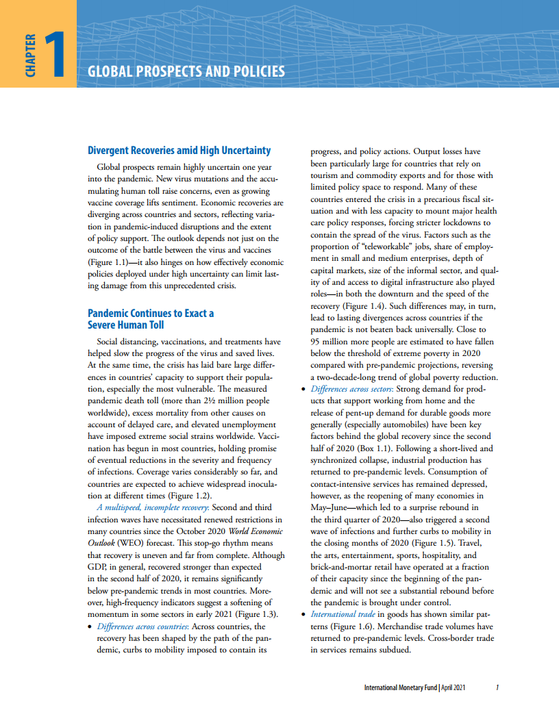 报告表示,新冠疫情暴发一年后,全球前景仍然存在巨大的不确定性。尽管疫苗的持续推广提振了人们的情绪,但变异毒株的出现和病亡人数的不断增加引发了人们的担忧。
