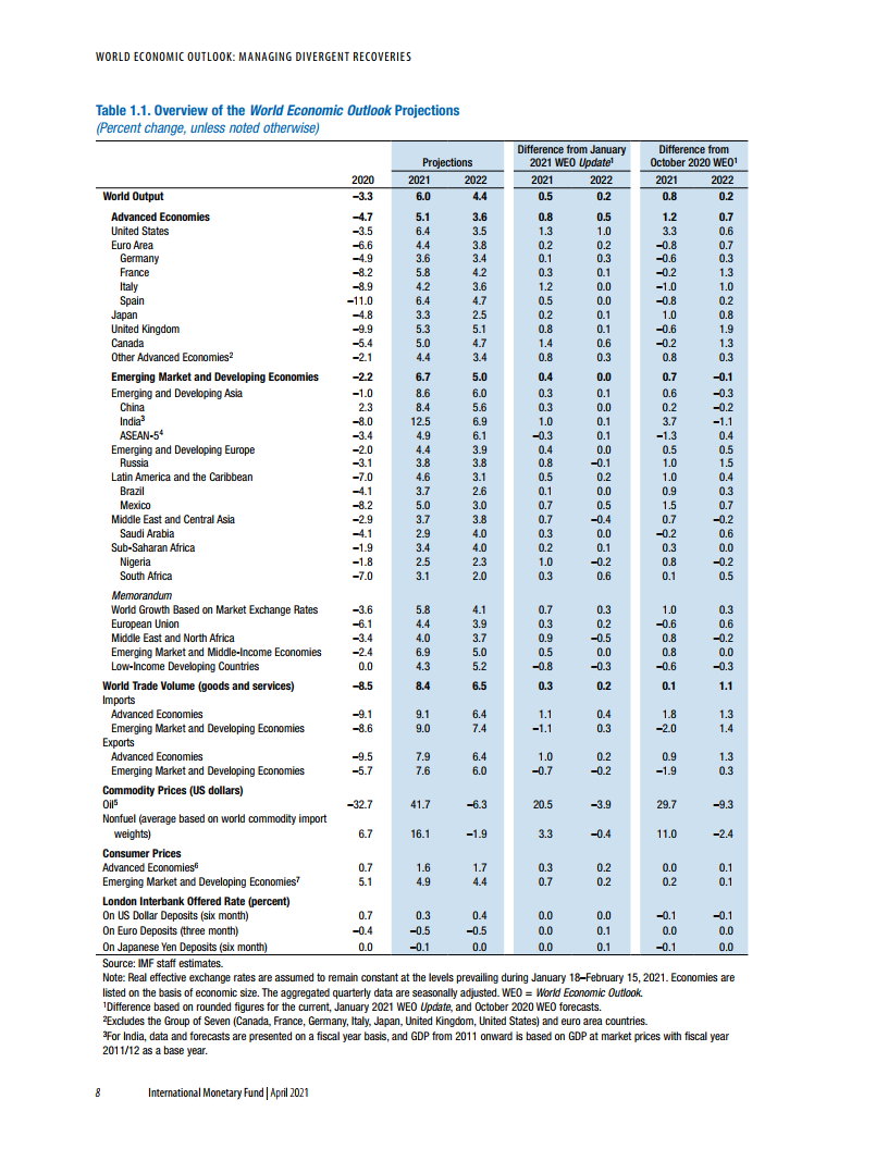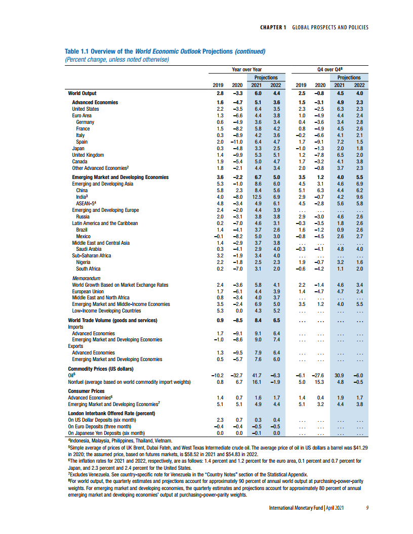 报告预测,2021年增长率最高的是来自亚洲新兴市场和发展中经济体,其中印度为12.5%;主要发达经济体的增长率如下:美国6.4%、德国3.6%、法国5.8%、意大利4.2%、西班牙6.4%、日本3.3%、英国5.3%、加拿大5.0%。