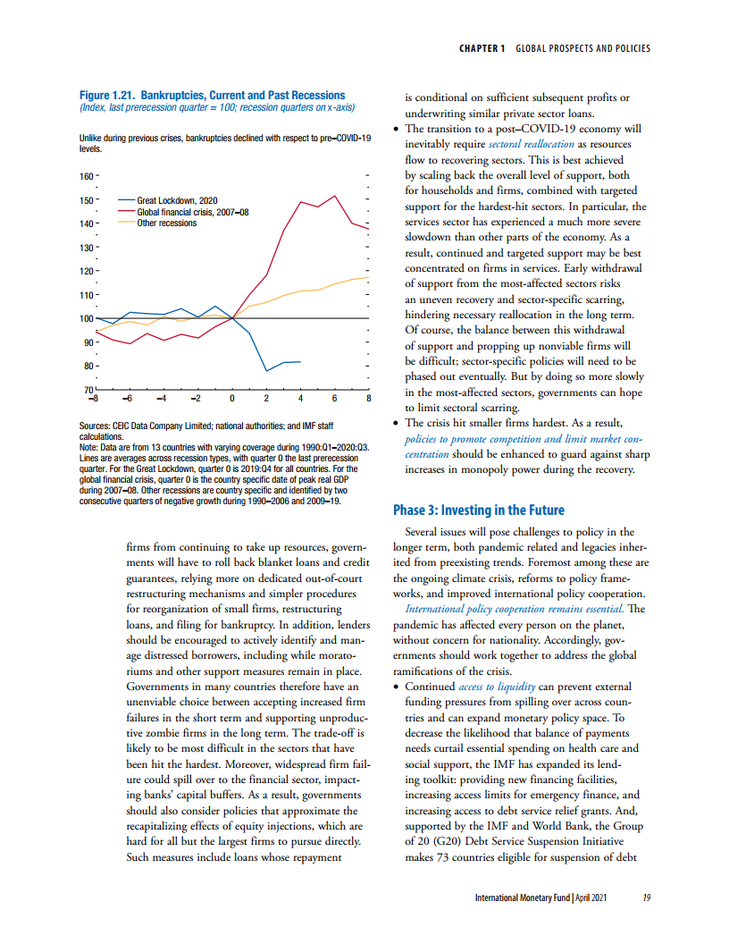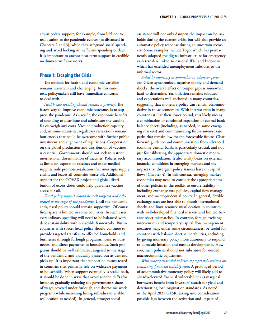 报告指出,决定各国适当政策立场的因素各不相同,尤其取决于各国回归正常的进度。因此,各国需要根据其所处的疫情阶段、经济复苏的力度以及经济的结构特征来调整应对政策。一旦疫苗得到普及且医疗卫生体系的应急备用能力总体上恢复到疫情前的水平,就可以放松限制。
