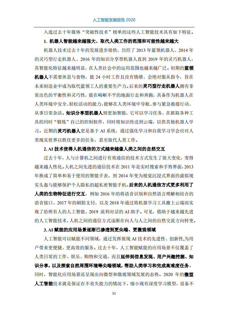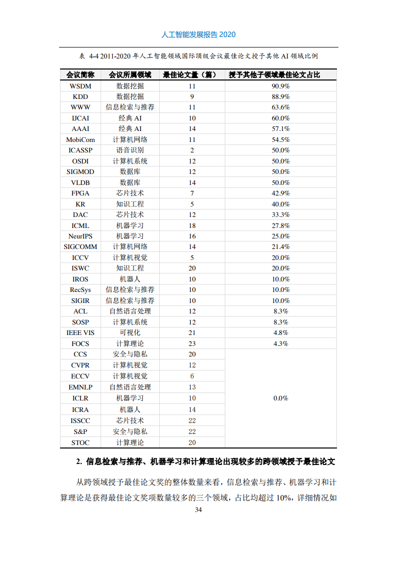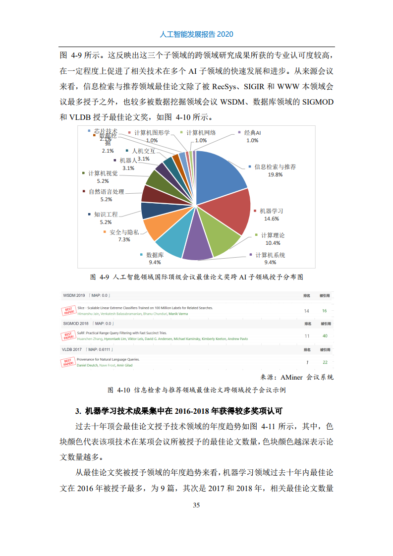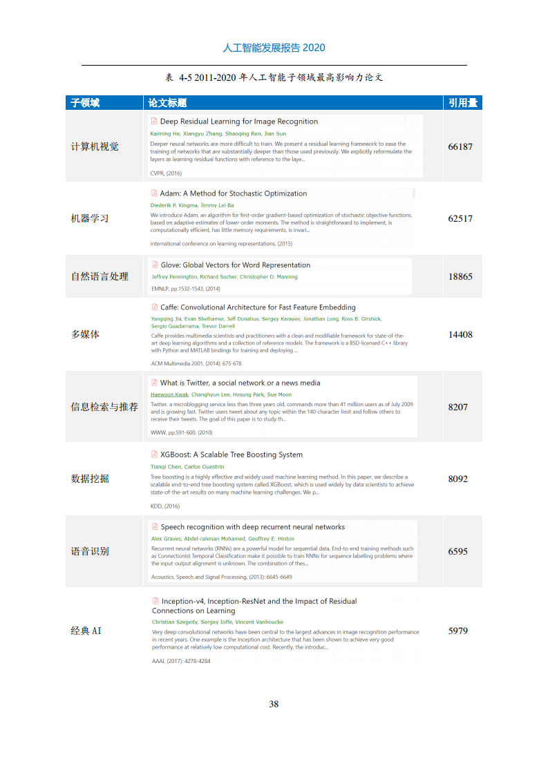 该报告基于清华大学唐杰教授团队自主研发的 “科技情报大数据挖掘与服务平台”(简称 AMiner)平台,根据 2011-2020 年期间人工智能领域的顶级期刊和会议(共计 44 个)所收录的全部论文和专利数据,全面展现了人工智能发展至今所获得的重大科研进展、成果产出以及科研热点。