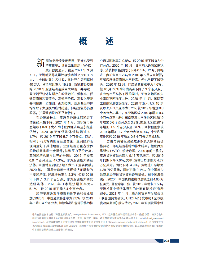 2020年,面对世纪大疫情和60年来首次经济萎缩,亚洲各国积极合作抗疫,在全球最早总体稳定疫情,恢复生产。2020年,亚洲经济总量占世界的份额进一步提升至47.3%,一体化进程持续推进,区域合作继续深化。贸易一体化水平稳步提升,亚洲作为全球价值链中心并未出现转移,经济体之间的服务贸易联系增强,数字贸易在疫情下加速发展。这些互通与合作为亚洲应对疫情和经济的双重挑战提供了强大支撑。