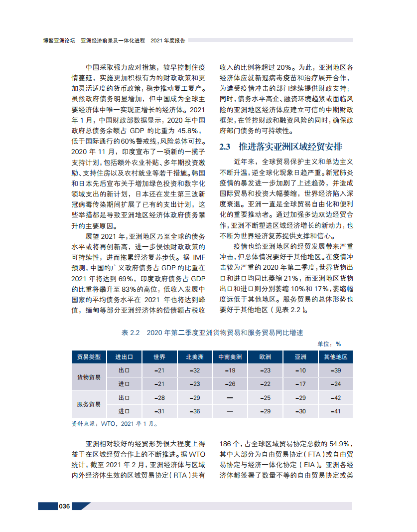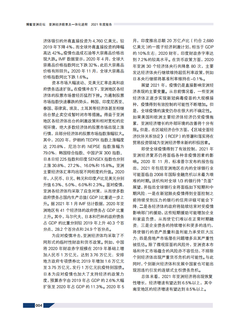 2021年,随着疫情逐步在全球得到控制,亚洲经济复苏步伐将提速,亚洲新兴经济体整体经济增速预计高于全球其他地区。区域内部货物贸易、以数字贸易为引领的服务贸易、直接投资与金融市场等领域进一步融合,基础设施互联互通提升,将成为疫情后亚洲经济发展的显著特点。