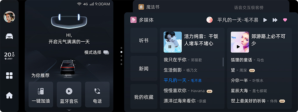 智能网联系统迭代至今,从用户界面上,延续了之前简洁现代的设计风格和以人为本的设计原则,并与车型的品牌元素保持一致性。基于当下语音交互的丰富性,以及主驾和副驾多屏交互的体验需求,全新一代的产品设计更多的展现了“可见即可控”的界面布局和交互能力。