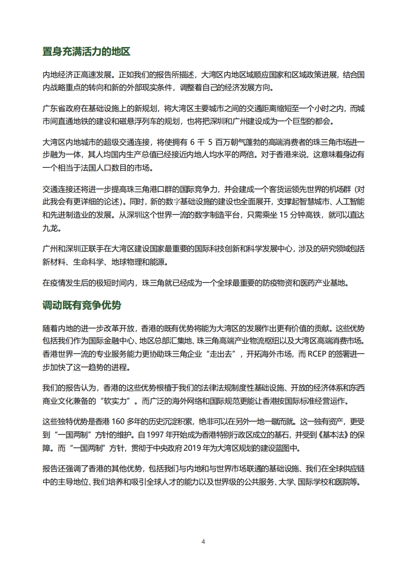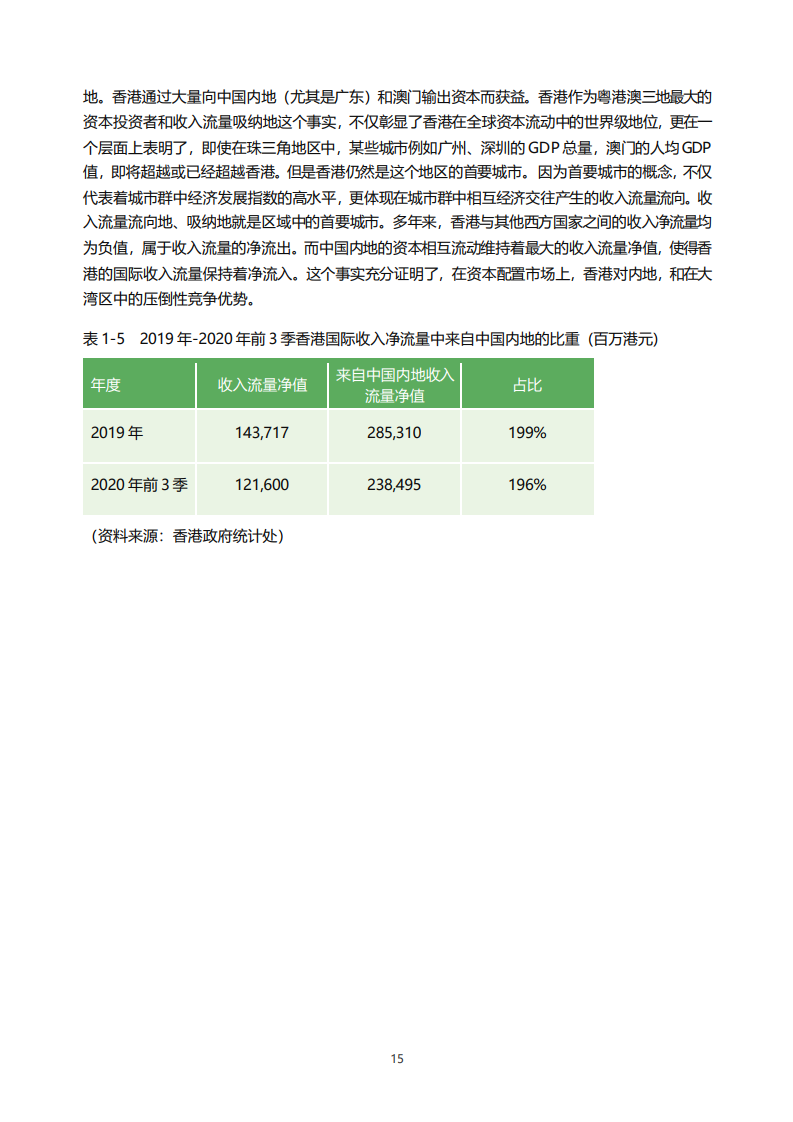 根据最新资料,2020 年中国企业市值的 500 强中,香港集聚的总部数量约占大湾区的四成。由此可见香港在大湾区中作为海外企业进入中国、中国企业联系海外的重要通道和门户地位。