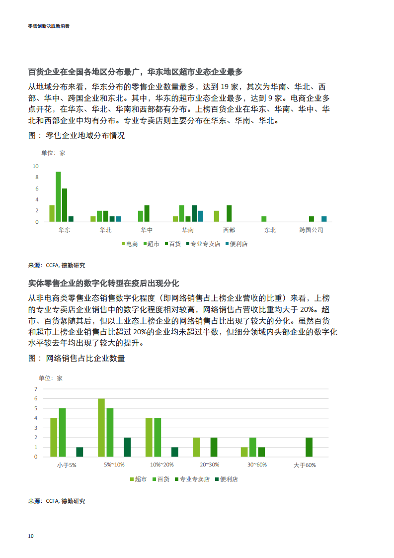 网络零售百强上榜企业首次覆盖全国各个地理分区。今年榜单首次出现了东北地区企业。从数量来看,华东地区继续领先全国,上榜企业数量达到46家,华北企业12家,华南企业21家,华中企业10家,西部企业6家,东北企业1家,以及跨国企业4家。从网络销售额来看,华北企业网络销售额占比最高,达52%,其次为华东地区企业占比31.1%,华南地区企业占比14.4%,跨国企业占比1.2%,华中、西部、东北地区占比较少,均小于1%。