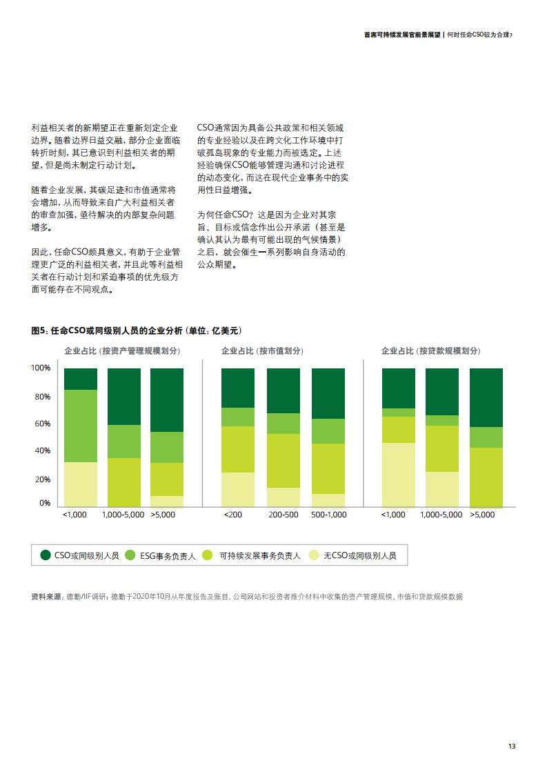 随着企业发展,其碳足迹和市值往往会增加,从而导致外部利益相关者审查不断加强,因此对于企业提出更高期望,但是企业尚未找到利用现有组织架构、管理层和治理框架实现目标的方法。CSO在大型企业更为常见,而具备公共政策和相关领域专业经验的CSO也更能够管理沟通和讨论进程的动态变化。