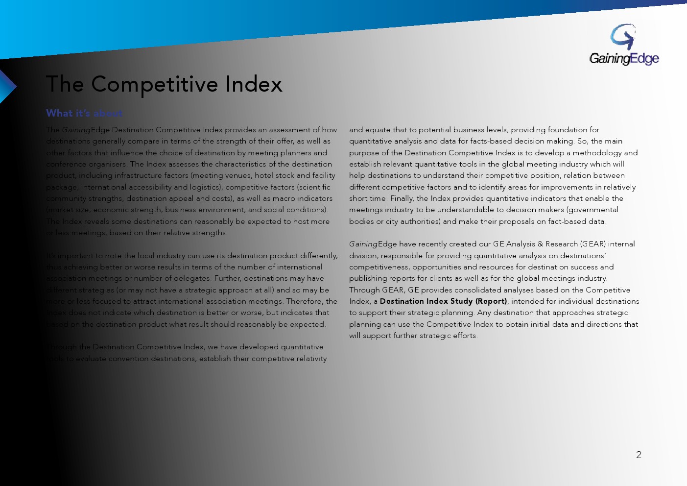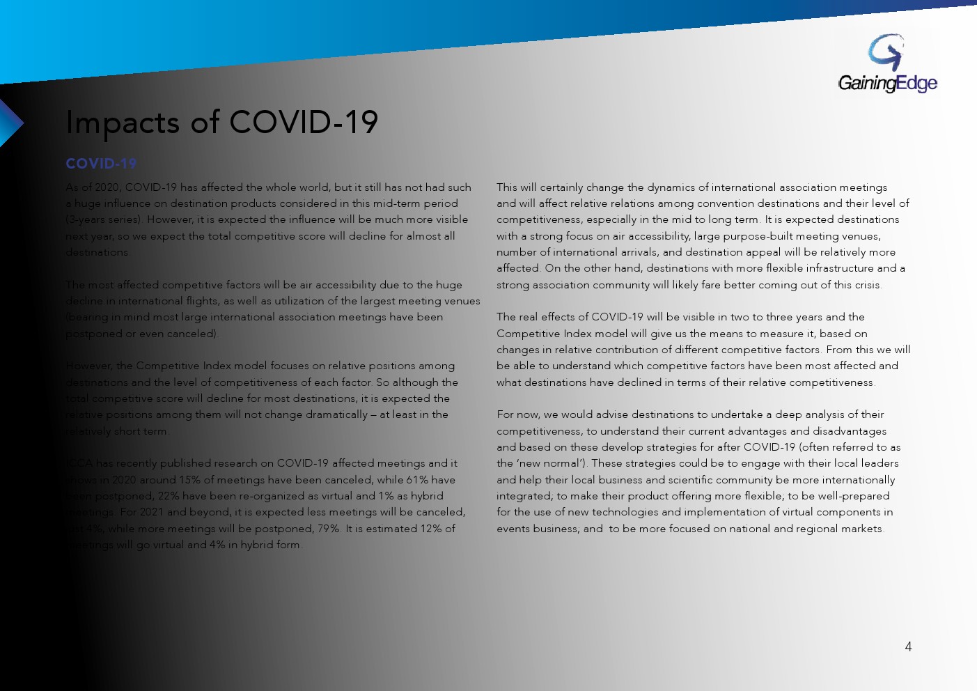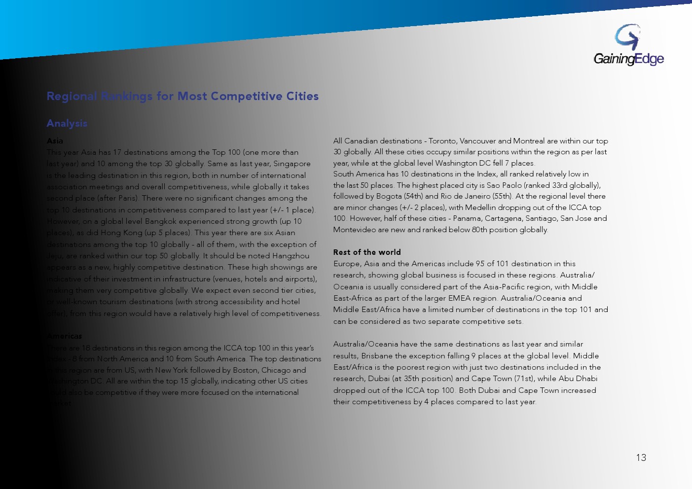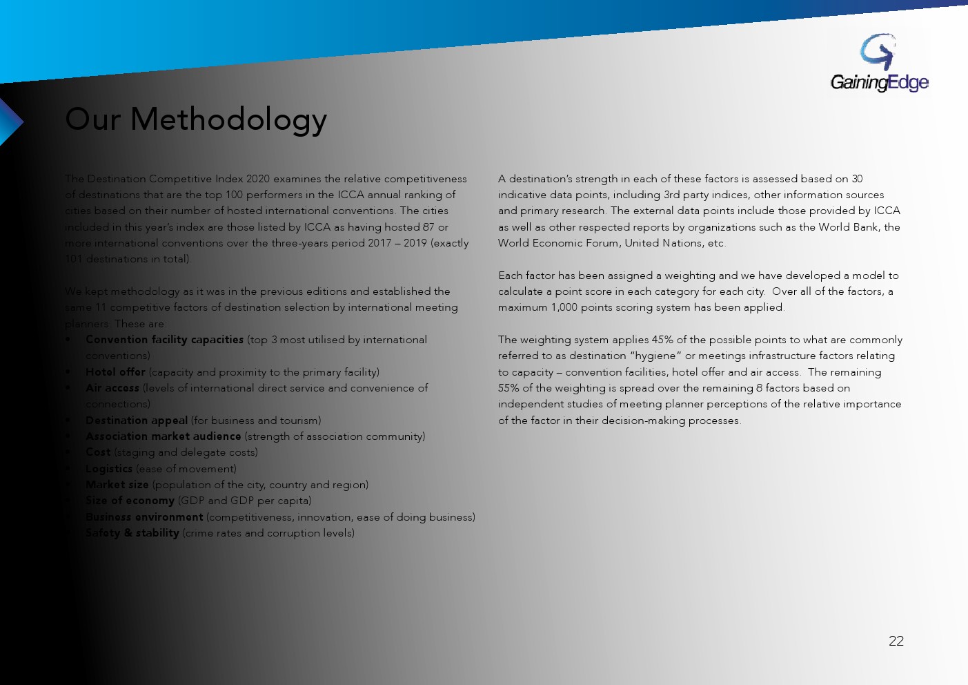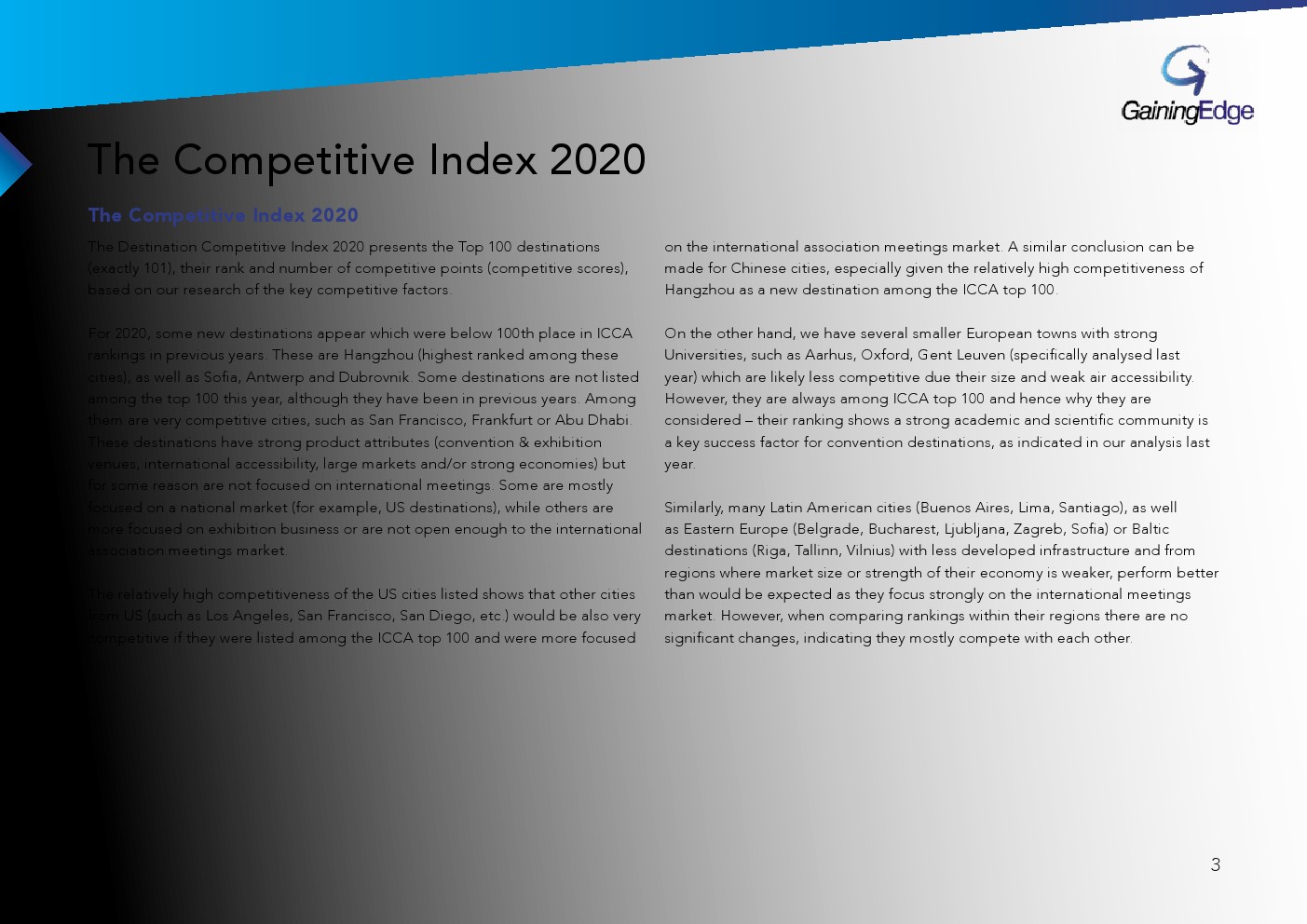 GainingEdge发布了“2020年竞争力指数报告”。这是一种创新的基准测试工具,根据城市吸引国际会议的竞争力对城市进行排名。