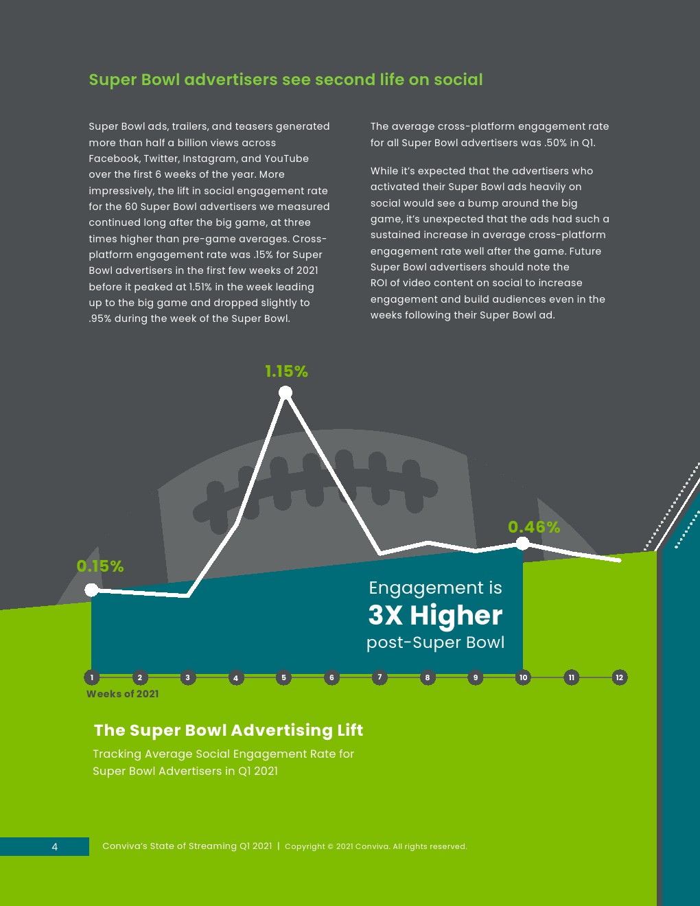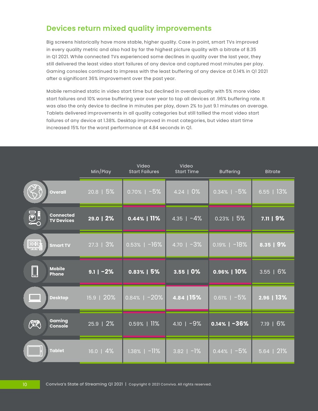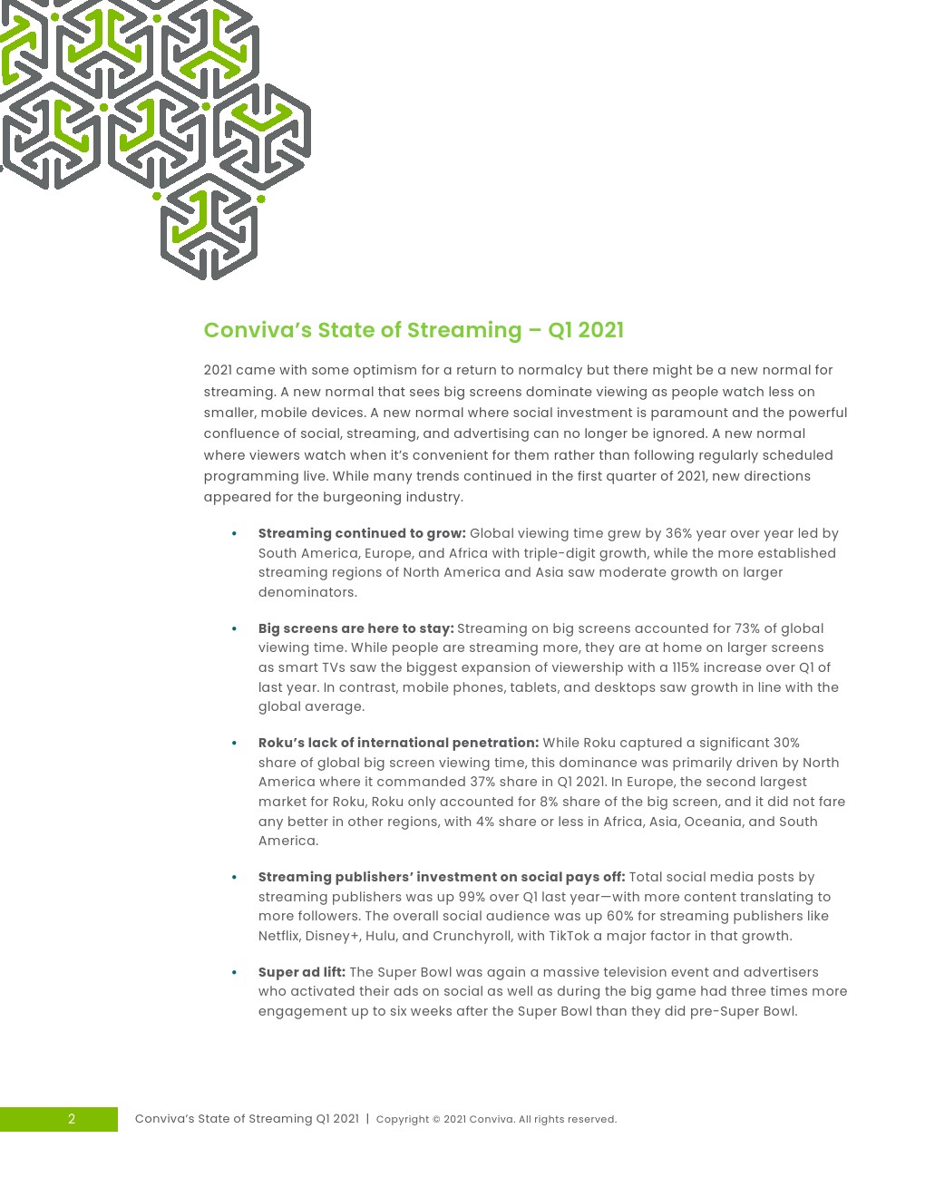 2021年初,人们对恢复常态持乐观态度,但流媒体可能会出现新的常态。人们在移动设备上观看的节目越来越少,大屏幕占据主导地位。社交、流媒体和广告的强大融合已不容忽视。观众可以在方便的时候观看节目,而不是按照常规的节目单进行。虽然许多趋势在2021年第一季度继续着,但新兴行业出现了新的发展方向。