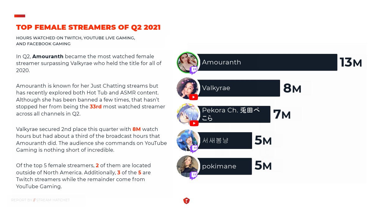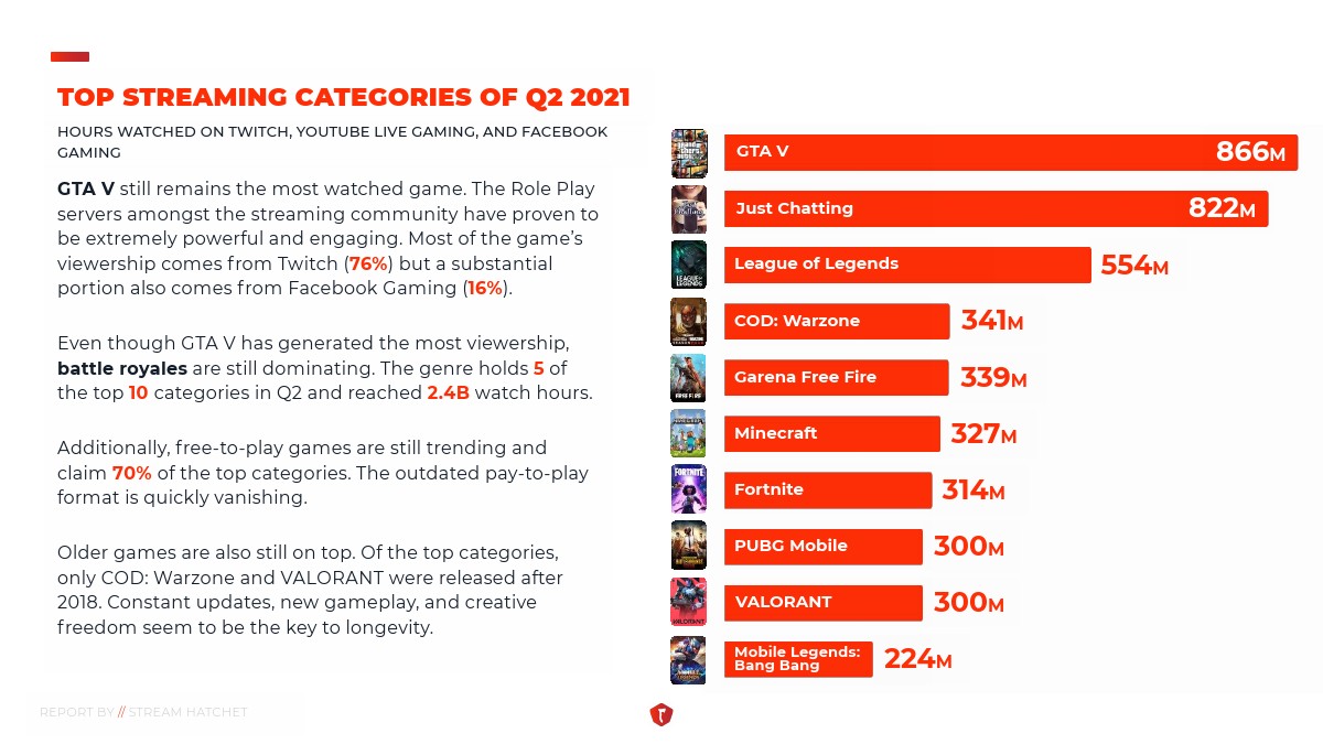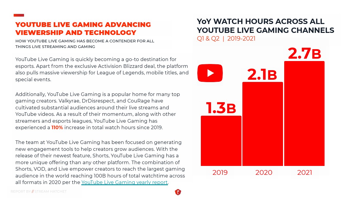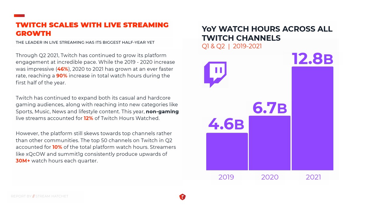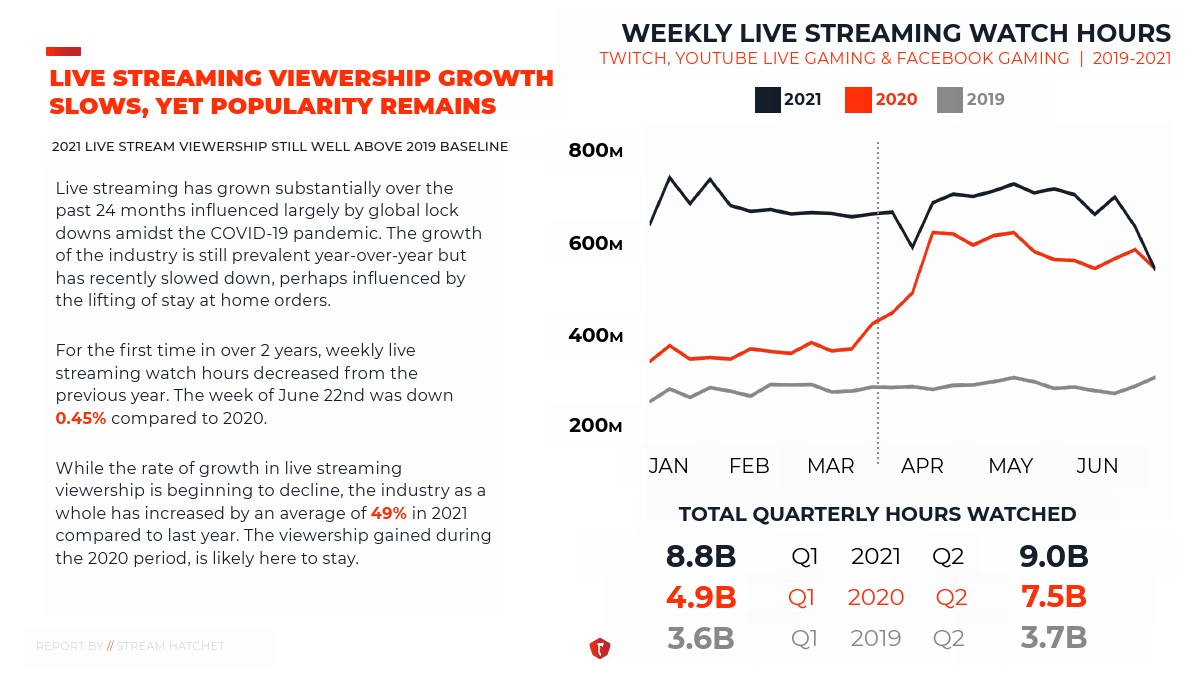 第二季度的数据显示,虽然直播观众的增长率开始下降,但与去年相比,整个行业平均增长了49%。此外,YouTube Gaming、Facebook Gaming和Twitch这三大直播平台的周观看时间都有所增加,第二季度总计观看了90亿小时。