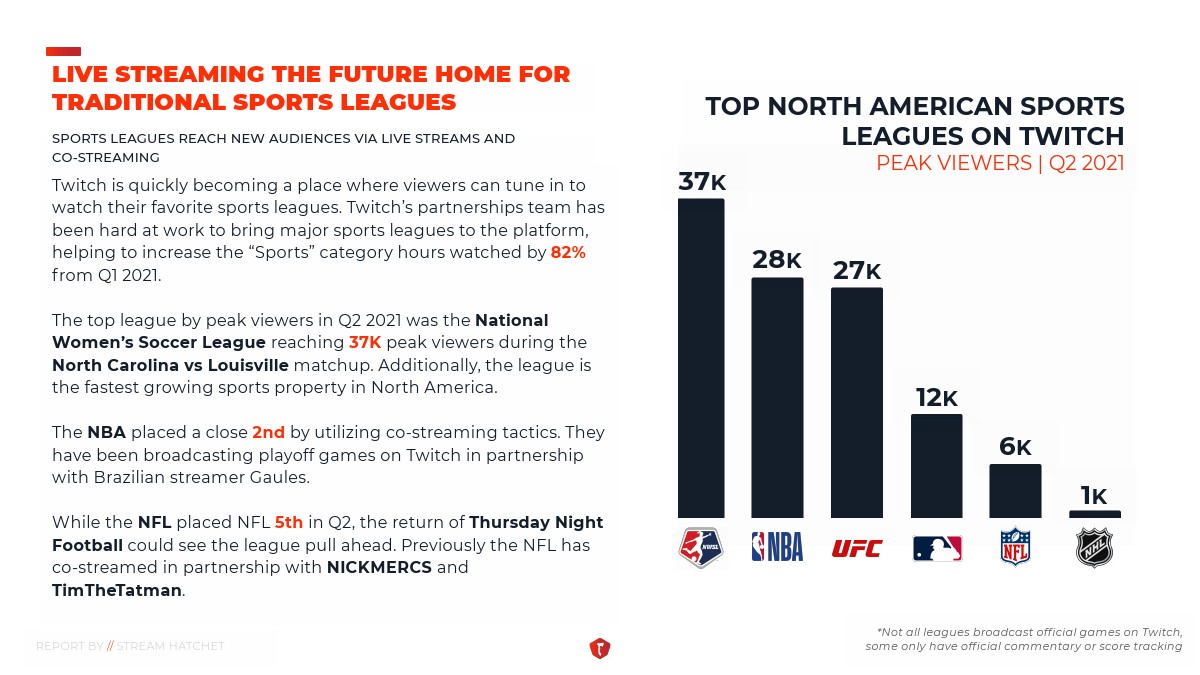 Twitch正在迅速成为一个体育平台,观众可以收看他们喜爱的体育联赛。Twitch的合作团队一直致力于将各大体育联盟纳入这个平台。2021年第一季度开始,“体育”类节目的观看时间增长了82%。