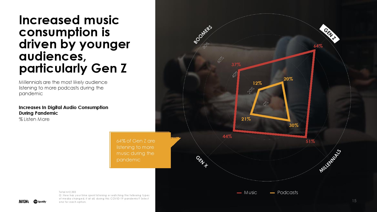 数字音频增长的部分原因是新冠大流行,66%的受访者表示他们患有屏幕疲劳症,75%的受访者表示这是收听更多数字音频的重要原因。受访者还报告说,数字音频的多任务、亲密风格带来了更广泛的开放性、关注度和广告互动。播客听众似乎更专注于他们所听的内容。55%的电视节目观众喜欢自己看的节目,66%的博客听众喜欢自己收听的播客。而且播客听众更倾向于狂听(46%),而喜欢狂看片的电视观众只有37%。至关重要的是两种媒体受众对广告的接受程度差异很大。67%的播客听众接受收播客广告,相比之下,46%的电视观众关注电视广告。也许令人惊讶的是,38%的音频听众更愿意接受以视觉为重点的行业的广告,如零售、汽车和娱乐业。相比之下,非视觉行业占29%。调查发现,尽管各代人都表示,自从新冠大流行以来,他们的播客收听量都有所增加,但千禧一代人的收听量增长尤其明显(增长了30%)。Z世代的收听量增长了20%,X世代增长了21%,婴儿潮一代增长了12%。