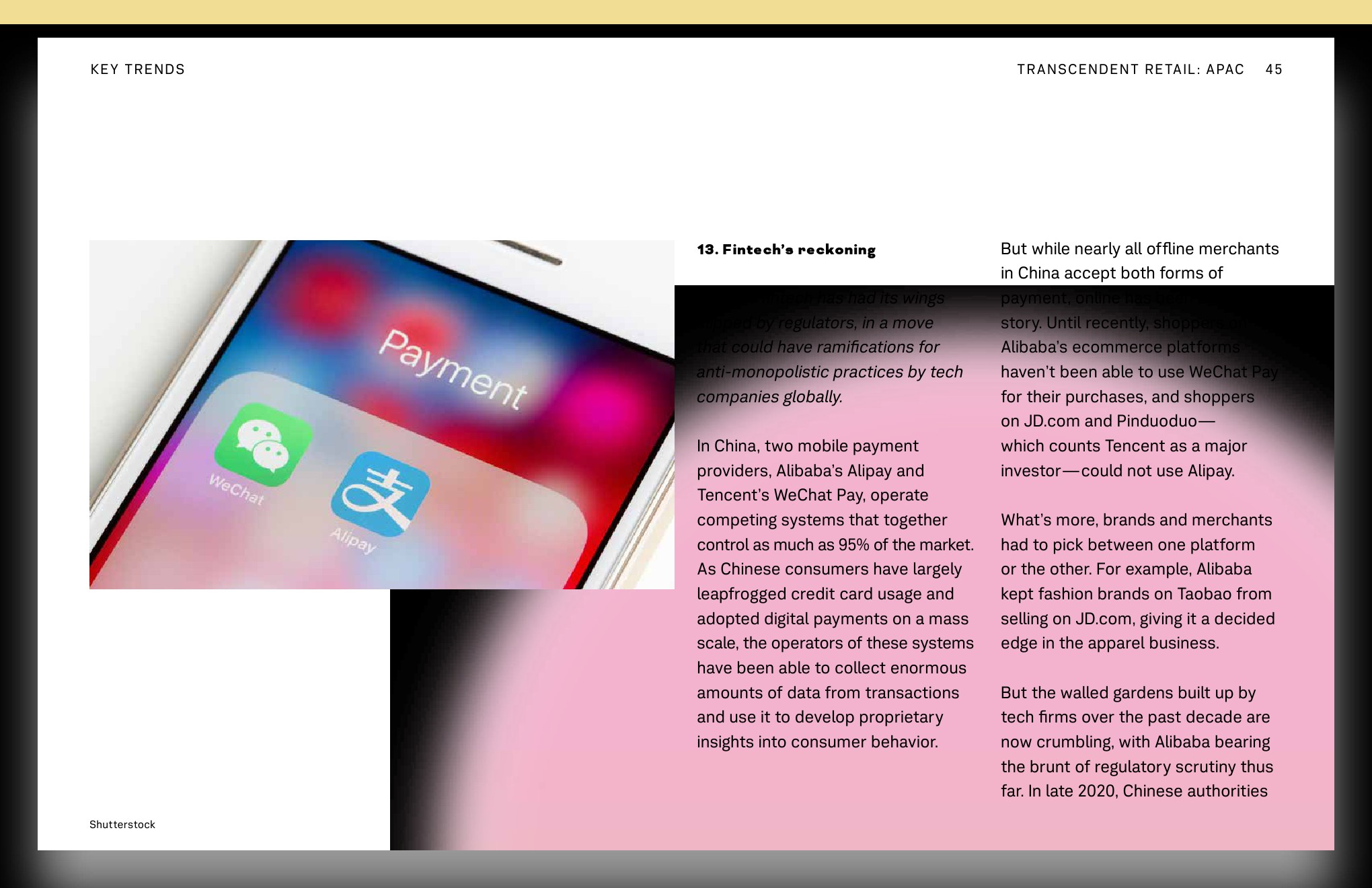 中国在全球电子商务中的主导地位并非偶然。它的出现是因为一系列特定的计划:向农村社区推出高速移动网络;仓储、配送等物流网络建设;以及近年来移动支付的广泛普及。再加上中国的领先科技公司将购买、社交和游戏无缝连接在一起,例如阿里巴巴的天猫、京东和腾讯的微信,以及最近的短视频平台抖音(在中国以外称为 TikTok)和 Bilibili。