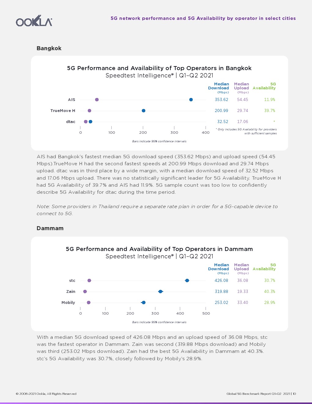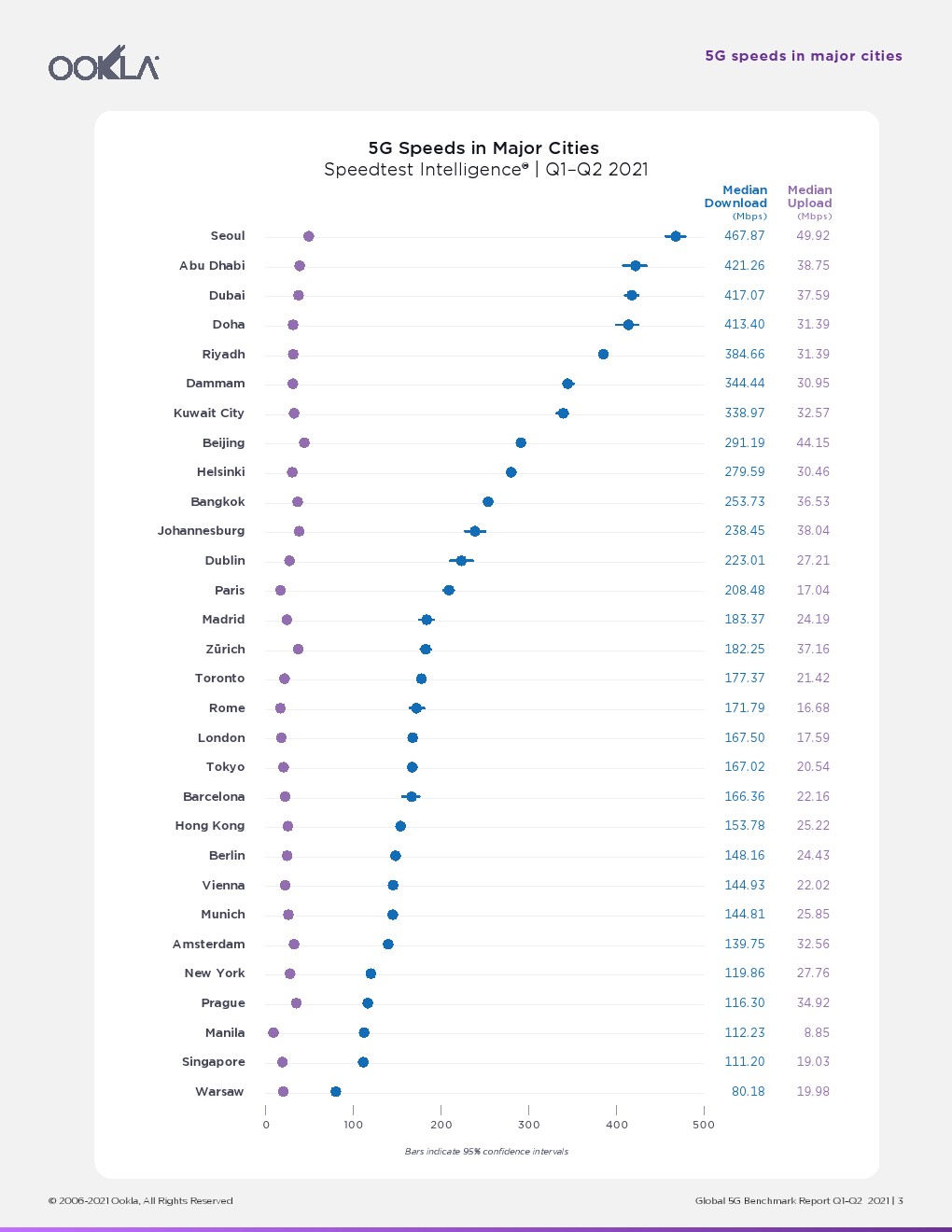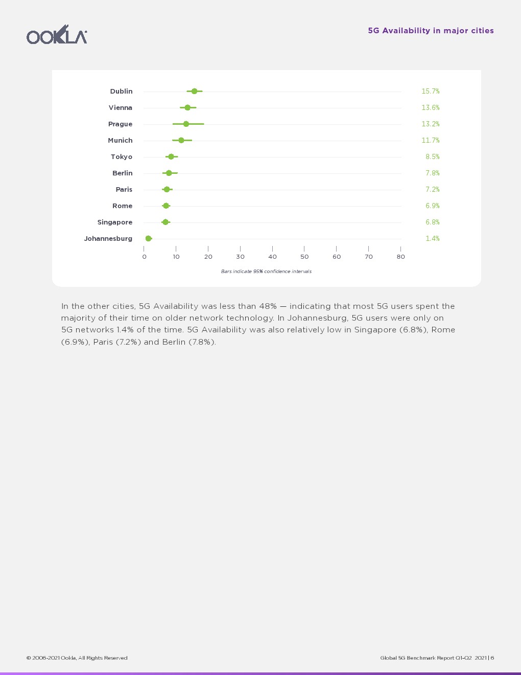 2021年已经过半,Ookla调查了全球主要城市的5G性能和可用性。