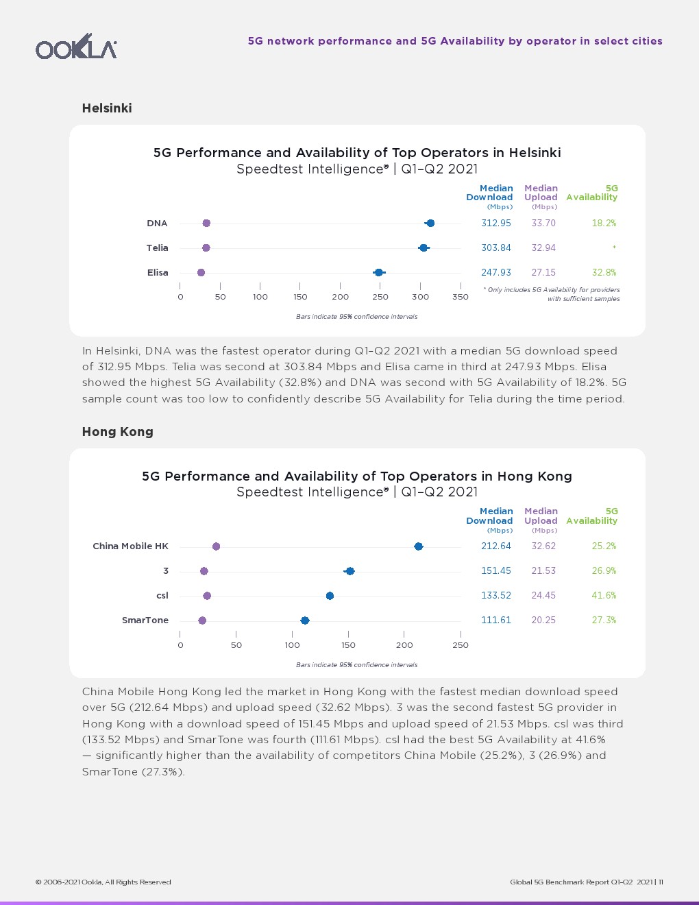 Ookla对2021年第一季度和第二季度全球30个主要城市的5G性能和可用性进行了测试。还深入调查了10个城市内顶级移动网络运营商的5G性能。本次全球5G性能评估突出了三个关键指标: