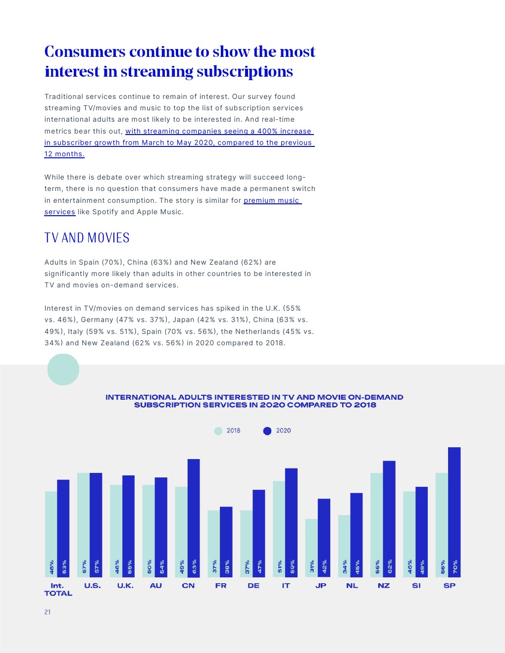 订阅服务的增加包括杂货配送(2020年为30%,2018年为26%),音乐服务(从29%增长到33%)和SVOD(从46%增长到53%)等行业。毫无疑问,COVID-19大流行助长了这些增长。