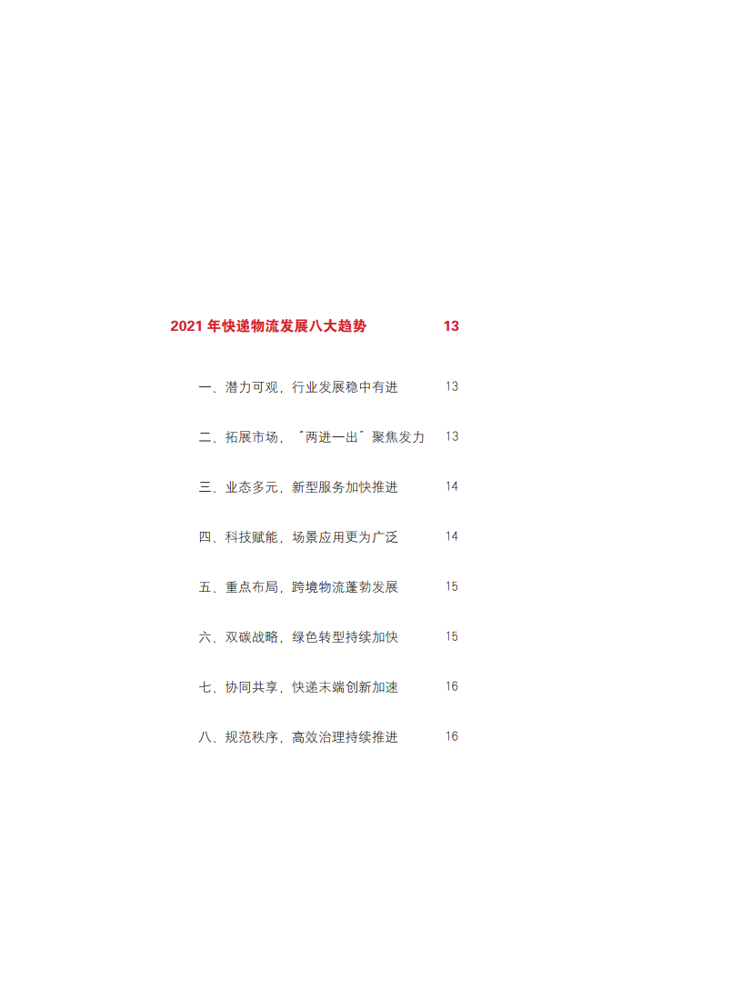 报告展望了2021年快递产业发展的8大趋势:一是潜力可观,行业发展稳中有进;二是拓展市场,“两进一出”聚焦发力 ;三是业态多元,新型服务加快推进;四是科技赋能,场景应用更为广泛;五是重点布局,跨境物流蓬勃发展;六是双碳战略,绿色转型持续加快;七是协同共享,快递末端创新加速;八是规范秩序,高效治理持续推进。