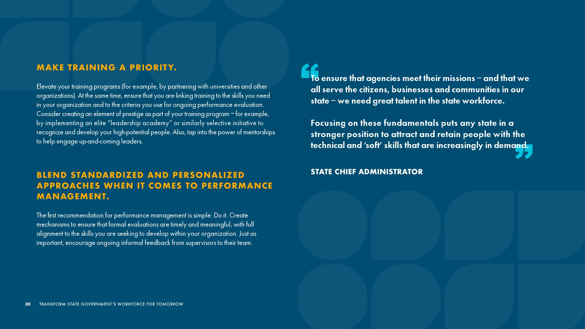 该报告包括美国各州的最佳实践范例。路易斯安那州在2016年进行了一项规划工作,揭示了主管的关键能力,并启动了建设这些能力的努力。宾夕法尼亚州开发了一个退休预测模型,以支持主动制定继任计划。田纳西州已经开发了一个全州员工学习课程,一个领导力学院,并建立了一个导师计划。