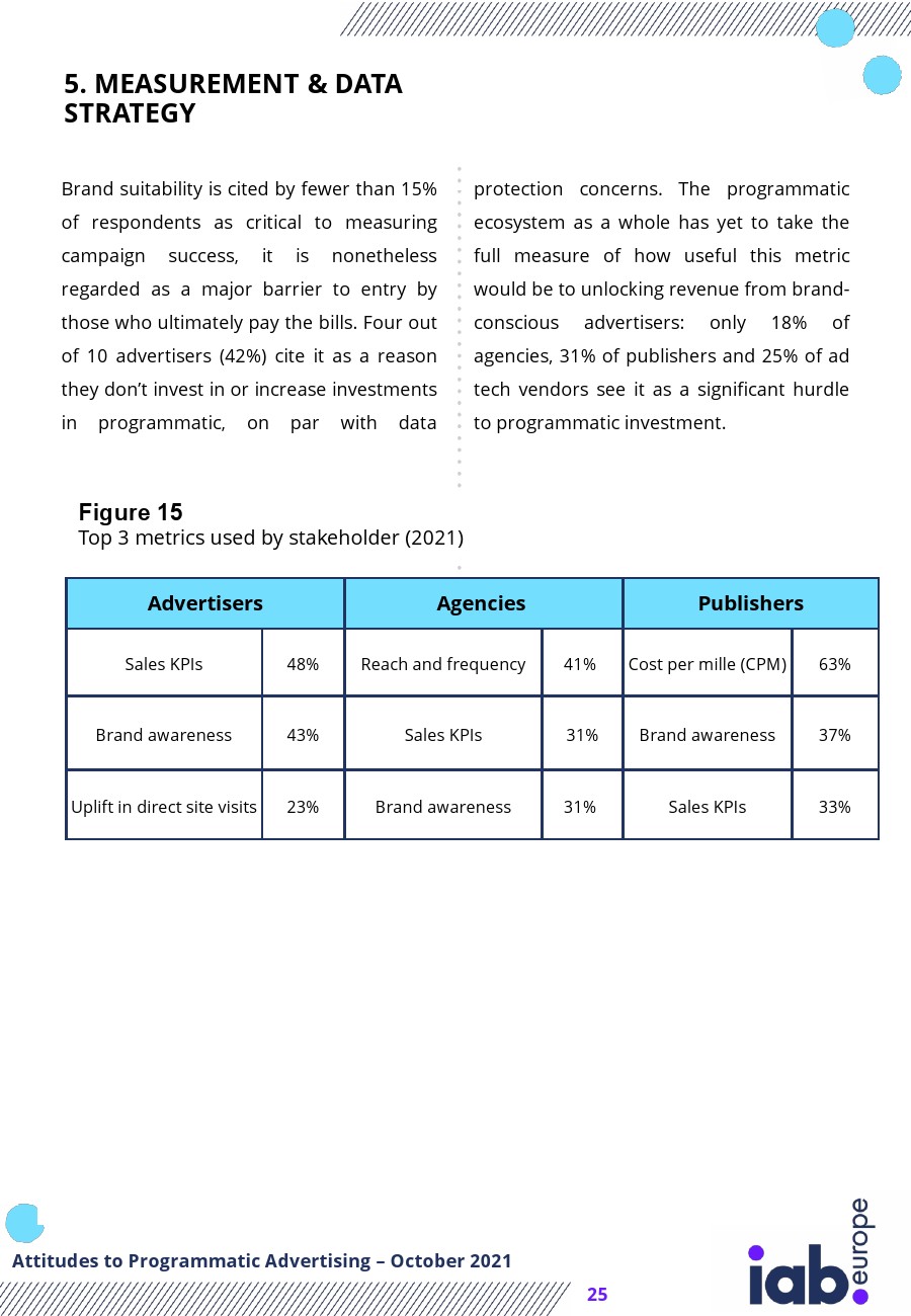 尽管全球大流行,广告程序化购买投资仍然相当稳定。视频广告程序化购买也在增长。代理机构和广告主越来越多地采用行业标准,如App ads.txt、Sellers.json、bullers.json、Supply Path Object、Demand Path Object。在其他形式的投资方面,联网电视是先行者。2021年,19%的广告主将其广告程序化购买预算的21%-40%分配给了CTV。因此,IAB在今年的报告中加入了更详细的CTV部分。在2020年出现一些下降后,内部再次成为一个关键趋势。2021年,50%的广告主有广告程序化购买交易的内部模式,2020年这一比例为20%。这主要是因为企业希望加强对运营的控制、第一方数据管理以及提高广告的透明度。2021年,在研究项目投资的关键驱动因素时,排名靠前的位置没有变化。大多数买方和卖方决策者认为,更好地利用数据是2021年规划投资的主要加速器。此外,有一半的广告主正在投资项目以大规模获取优质库存。2020年,广告主投资广告程序化购买的最大障碍是供应链透明度,60%的广告主这么表示。但是,在2021年这一比例下降了50%以上,只有25%的广告主选择。这表明该行业正在为提高买方的透明度做出重大努力。广告主的新担忧已经转向品牌安全,42%的广告主将品牌安全视为关键障碍,而2020年这一比例仅为10%。在数据和测量方面,管理平台在所有利益相关者中的使用都有所增加。