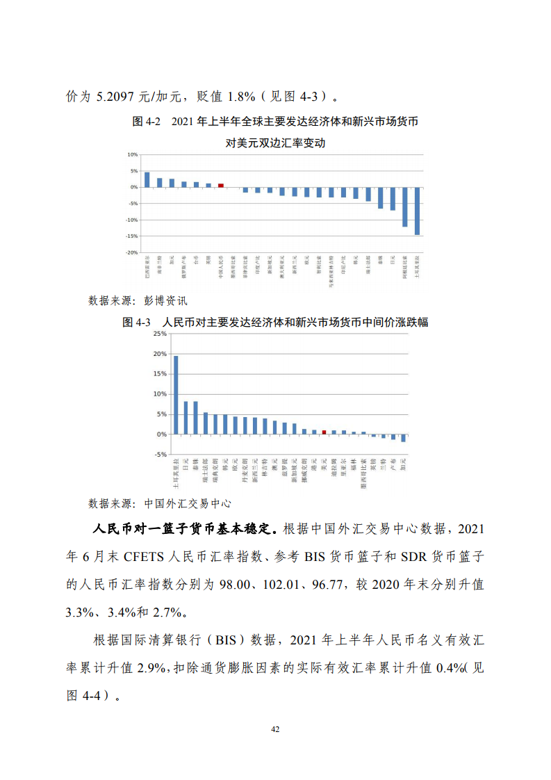 2021 年上半年,新冠肺炎疫情继续在全球蔓延,世界经济不平衡复苏,国际金融市场复杂多变。我国持续巩固拓展疫情防控和经济社会发展成果,国内经济呈现稳中加固、稳中向好发展态势。我国外汇市场运行总体稳健,人民币汇率双向波动,在合理均衡水平上保持基本稳定。